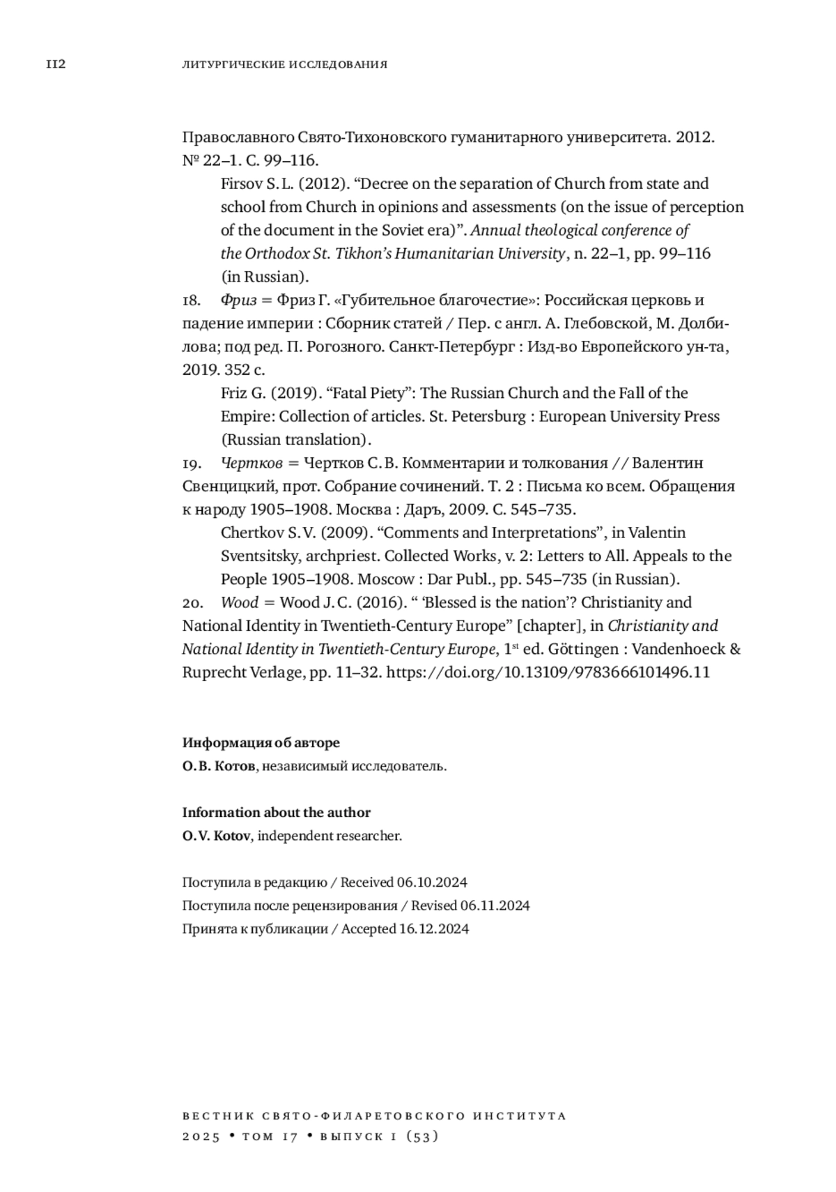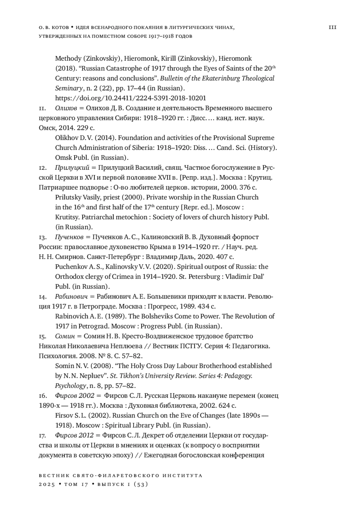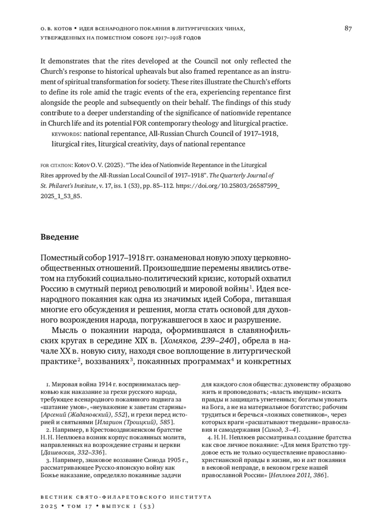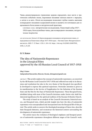 КОТОВ О. В. ИДЕЯ ВСЕНАРОДНОГО ПОКАЯНИЯ В ЛИТУРГИЧЕСКИХ ЧИНАХ, УТВЕРЖДЕННЫХ НА ПОМЕСТНОМ СОБОРЕ 1917–1918 ГОДОВ // ВЕСТНИК СВЯТО-ФИЛАРЕТОВСКОГО ИНСТИТУТА. 2025. № 1 (53), ТОМ 17
