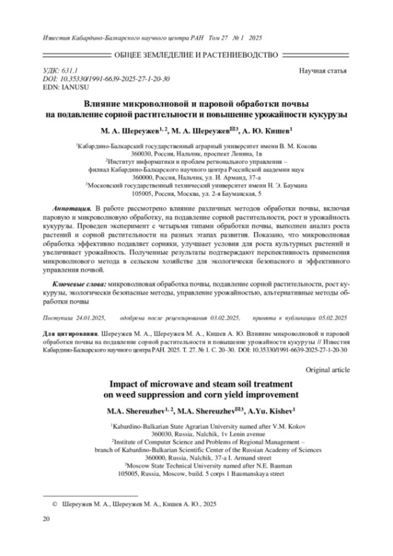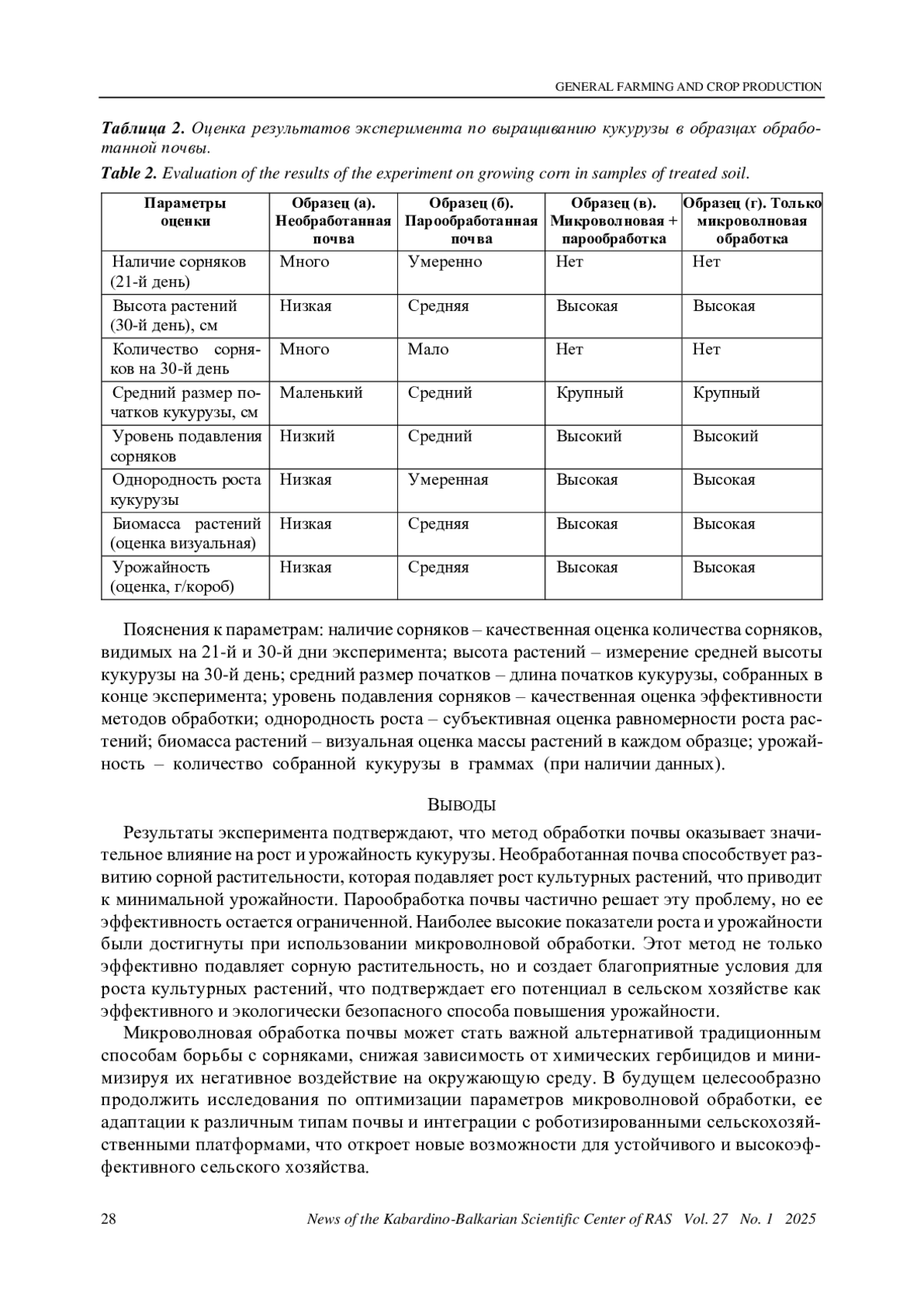 В работе рассмотрено влияние различных методов обработки почвы, включая паровую и микроволновую обработку, на подавление сорной растительности, рост и урожайность кукурузы. Проведен эксперимент с четырьмя типами обработки почвы, выполнен анализ роста растений и сорной растительности на разных этапах развития. Показано, что микроволновая обработка эффективно подавляет сорняки, улучшает условия для роста культурных растений и увеличивает урожайность. Полученные результаты подтверждают перспективность применения микроволнового метода в сельском хозяйстве для экологически безопасного и эффективного управления почвой.