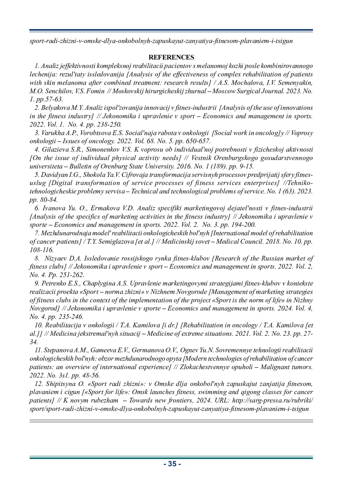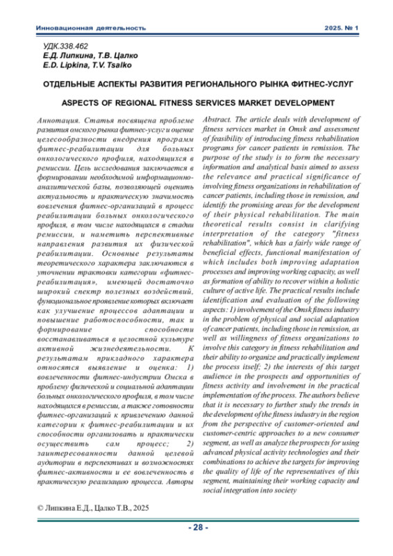 Статья посвящена проблеме развития омского рынка фитнес-услуг и оценке целесообразности внедрения программ фитнес-реабилитации для больных онкологического профиля, находящихся в ремиссии. Цель исследования заключается в формировании необходимой информационно- аналитической базы, позволяющей оценить актуальность и практическую значимость вовлечения фитнес-организаций в процесс реабилитации больных онкологического профиля, в том числе находящихся в стадии ремиссии, и наметить перспективные направления развития их физической реабилитации. Основные результаты теоретического характера заключаются в уточнении трактовки категории «фитнес- реабилитация», имеющей достаточно широкий спектр полезных воздействий, функциональное проявление которых включает как улучшение процессов адаптации и повышение работоспособности, так и формирование способности восстанавливаться в целостной культуре активной жизнедеятельности. К результатам прикладного характера относятся выявление и оценка: 1) вовлеченности фитнес-индустрии Омска в проблему физической и социальной адаптации больных онкологического профиля, в том числе находящихся в ремиссии, а также готовности фитнес-организаций к привлечению данной категории к фитнес-реабилитации и их способности организовать и практически осуществить сам процесс; 2) заинтересованности данной целевой аудитории в перспективах и возможностях фитнес-активности и ее вовлеченность в практическую реализацию процесса. Авторы полагают, что необходимо дальнейшее изучение направлений развития фитнес- индустрии региона с позиции клиентоориентированного и клиентоцентричного подходов для нового потребительского сегмента, а также анализ перспектив использования передовых технологий физической активности и их комбинаций для достижения целевых установок на улучшение качества жизни представителей данного сегмента, сохранения работоспособности и социальной интеграции в общество.