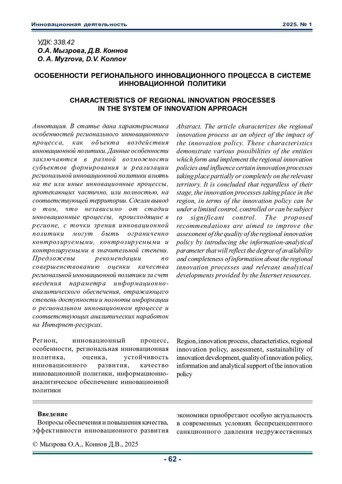 В статье дана характеристика особенностей регионального инновационного процесса, как объекта воздействия инновационной политики. Данные особенности заключаются в разной возможности субъектов формирования и реализации региональной инновационной политики влиять на те или иные инновационные процессы, протекающих частично, или полностью, на соответствующей территории. Сделан вывод о том, что независимо от стадии инновационные процессы, происходящие в регионе, с точки зрения инновационной политики могут быть ограниченно контролируемыми, контролируемыми и контролируемыми в значительной степени. Предложены рекомендации по совершенствованию оценки качества региональной инновационной политики за счет введения параметра информационно- аналитического обеспечения, отражающего степень доступности и полноты информации о региональном инновационном процессе и соответствующих аналитических наработок на Интернет-ресурсах.