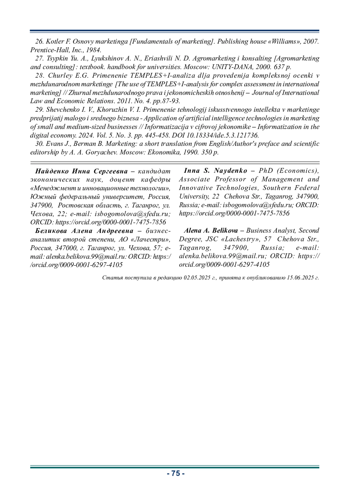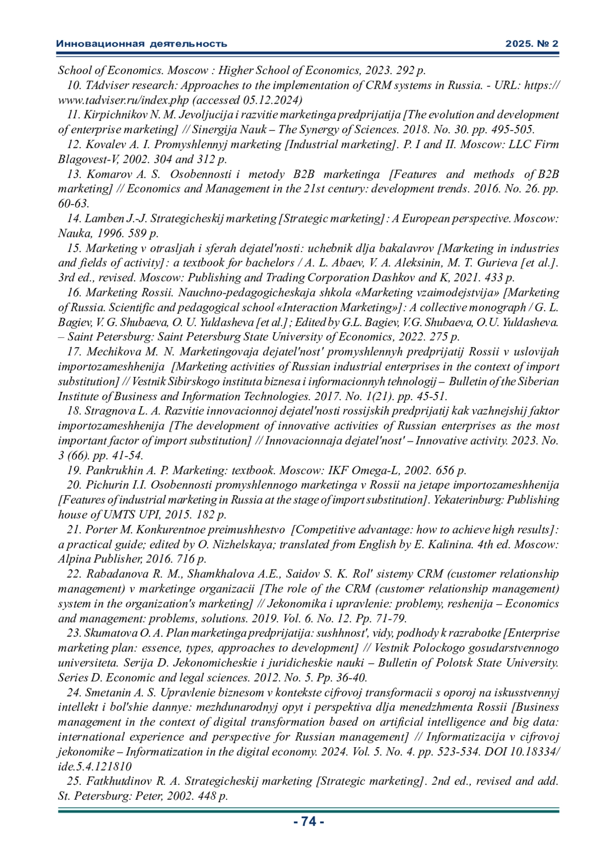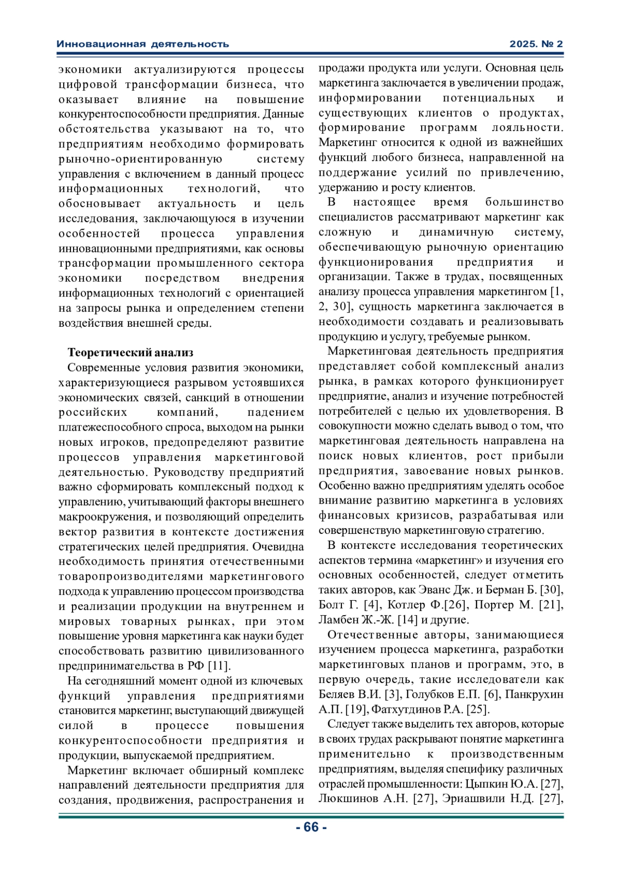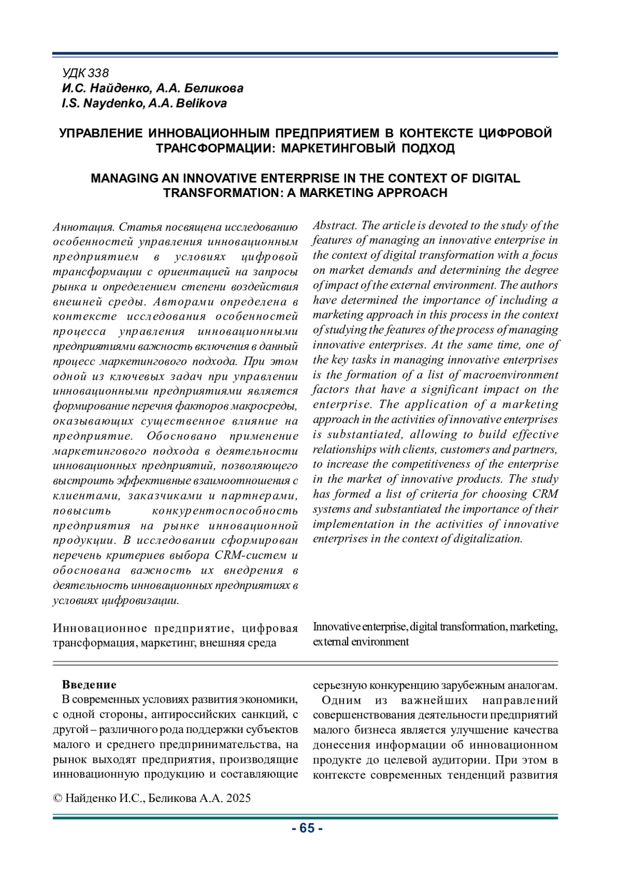 НАЙДЕНКО И. С., БЕЛИКОВА А. А. УПРАВЛЕНИЕ ИННОВАЦИОННЫМ ПРЕДПРИЯТИЕМ В КОНТЕКСТЕ ЦИФРОВОЙ ТРАНСФОРМАЦИИ: МАРКЕТИНГОВЫЙ ПОДХОД // ИННОВАЦИОННАЯ ДЕЯТЕЛЬНОСТЬ. 2025. № 2 (73)