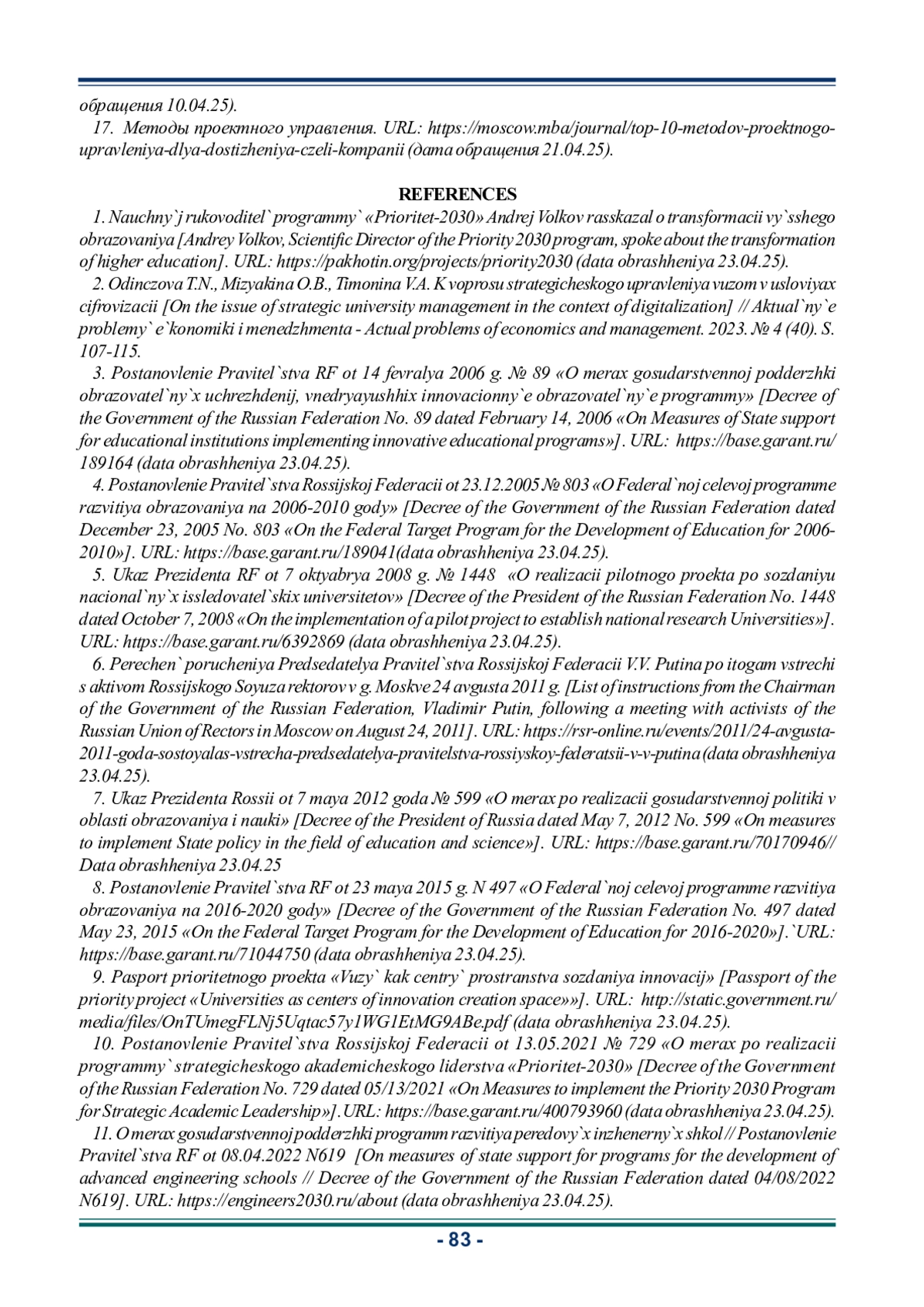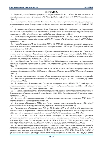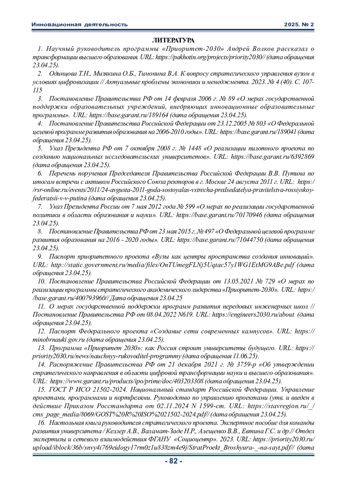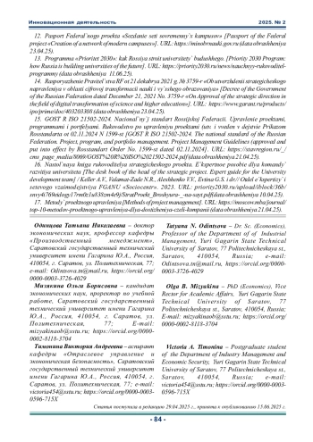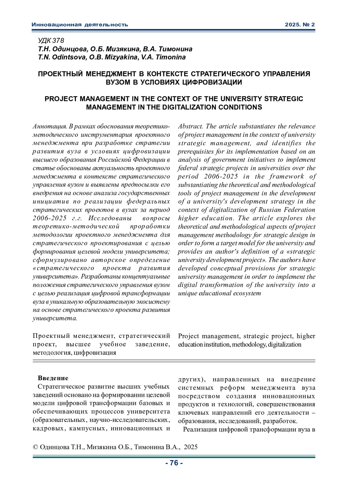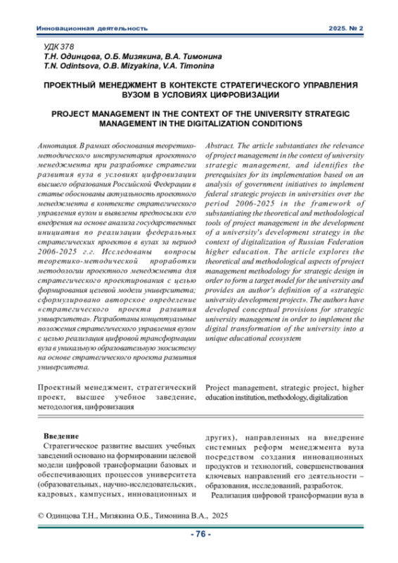 ОДИНЦОВА Т. Н., МИЗЯКИНА О. Б., ТИМОНИНА В. А. ПРОЕКТНЫЙ МЕНЕДЖМЕНТ В КОНТЕКСТЕ СТРАТЕГИЧЕСКОГО УПРАВЛЕНИЯ ВУЗОМ В УСЛОВИЯХ ЦИФРОВИЗАЦИИ // ИННОВАЦИОННАЯ ДЕЯТЕЛЬНОСТЬ. 2025. № 2 (73)