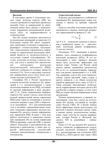 В статье обсуждаются сформированные за последние годы, начиная с 2003 года, тенденции оценивания инновационной активности (ИА) организаций в отраслях АПК, а именно, общего земледелия и растениеводства, рыбоводства и рыболовства, а также трех отраслей животноводства: сельскохозяйственных млекопитающих, птицеводства и пчеловодства. Обсуждаются две составляющие ИА: внутренняя и внешняя. Рассматриваются особенности недооценки в России внутренней ИА из-за недопатентования и основы методики ее уменьшения за счет учета трех групп патентов: стандартных, коммерциализированных и высокотехнологичных, а также диссертаций. Показано, что оценивание внешней ИА наиболее полно на основе группы двадцати стран технологических лидеров, близкой к «Большой двадцатке» G20. Обсуждается высокая информативность высокотехнологичных патентов. На основе их анализа выдвинута гипотеза о связи т. н. «крымских событий» с появлением скрытой, неявной политической цели «коллективного Запада» во главе с США и ЕС обеспечить их технологическое доминирование над Россией и ее изоляцию в области высоких технологий.