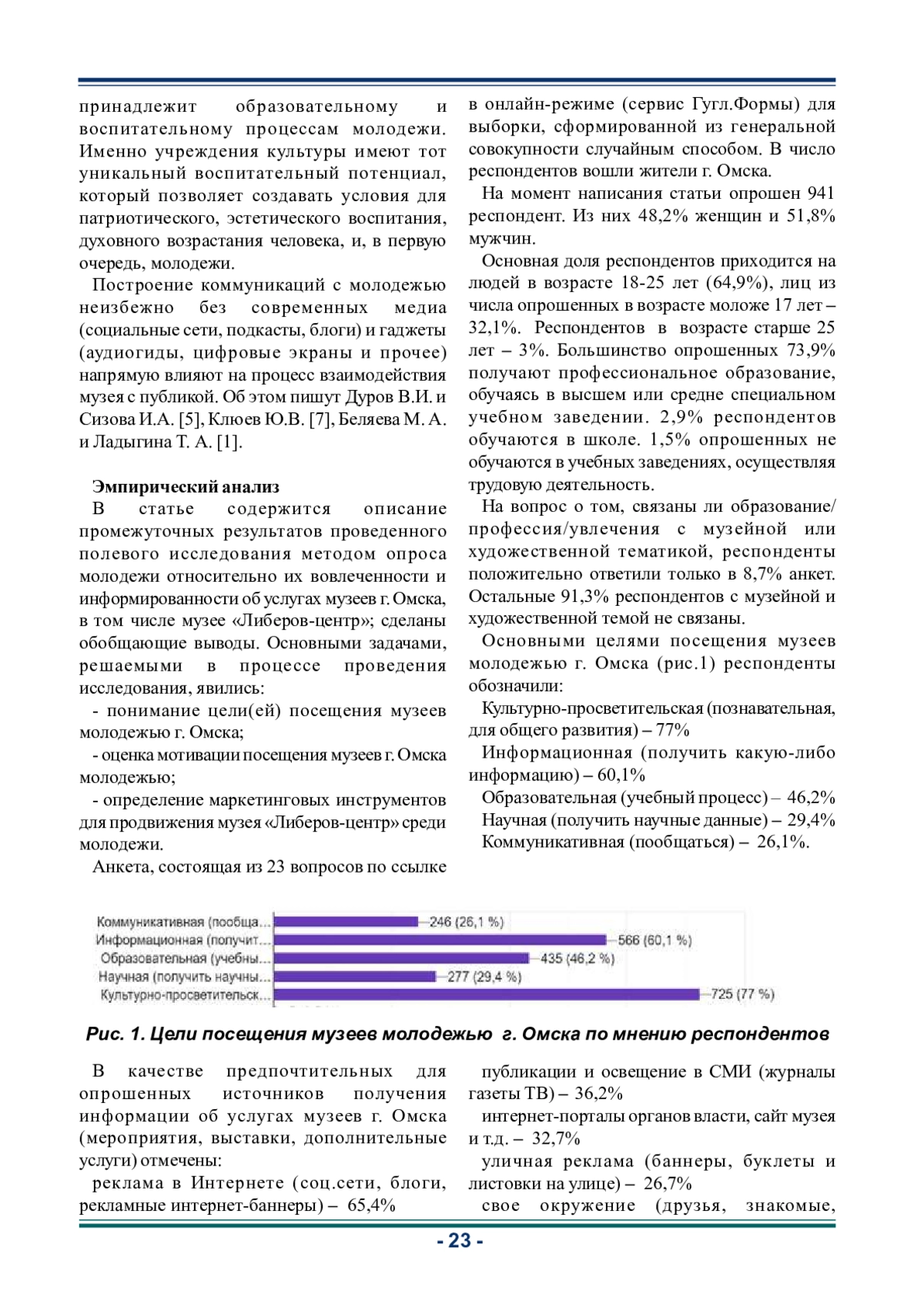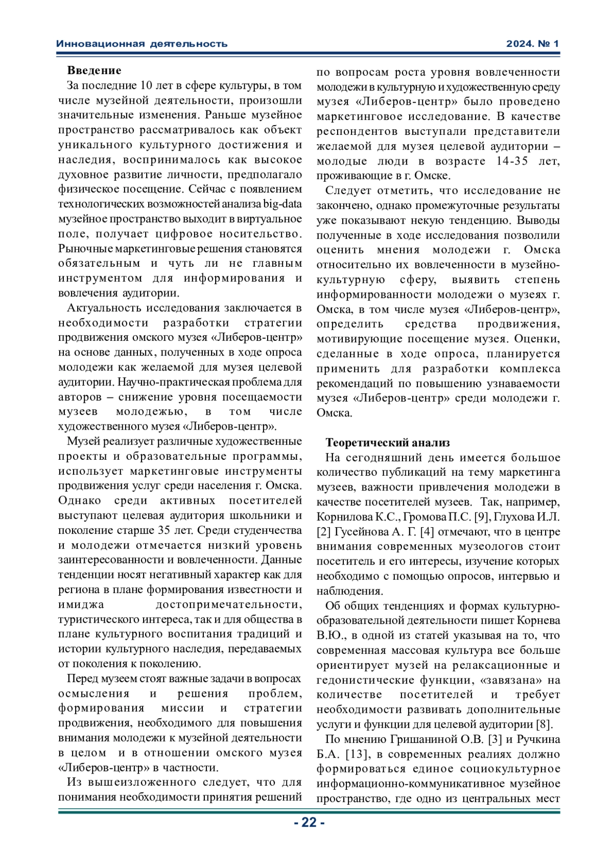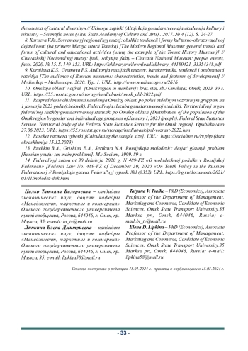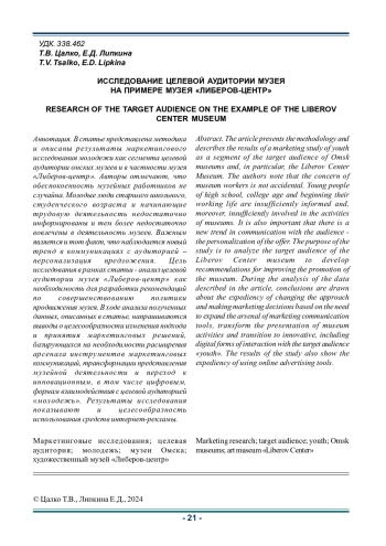 В статье представлена методика и описаны результаты маркетингового исследования молодежи как сегмента целевой аудитории омских музеев и в частности музея «Либеров-центр». Авторы отмечают, что обеспокоенность музейных работников не случайна. Молодые люди старшего школьного, студенческого возраста и начинающие трудовую деятельность недостаточно информированы и тем более недостаточно вовлечены в деятельность музеев. Важным является и тот факт, что наблюдается новый тренд в коммуникациях с аудиторией - персонализация предложения. Цель исследования в рамках статьи - анализ целевой аудитории музея «Либеров-центр» как необходимость для разработки рекомендаций по совершенствованию политики продвижения музея. В ходе анализа полученных данных, описанных в статье, напрашиваются выводы о целесообразности изменения подхода и принятия маркетинговых решений, базирующихся на необходимости расширения арсенала инструментов маркетинговых коммуникаций, трансформации представления музейной деятельности и переход к инновационным, в том числе цифровым, формам взаимодействия с целевой аудиторией «молодежь». Результаты исследования показывают и целесообразность использования средств интернет-рекламы.