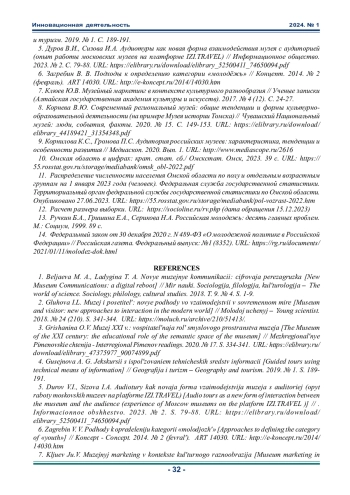 9. Корнилова К.С., Громова П.С. Аудитория российских музеев: характеристика, тенденции и особенности развития // Медиаскоп. 2020. Вып. 1. URL: http://www.mediascope.ru/2616. EDN: KTGKSQ