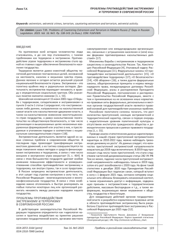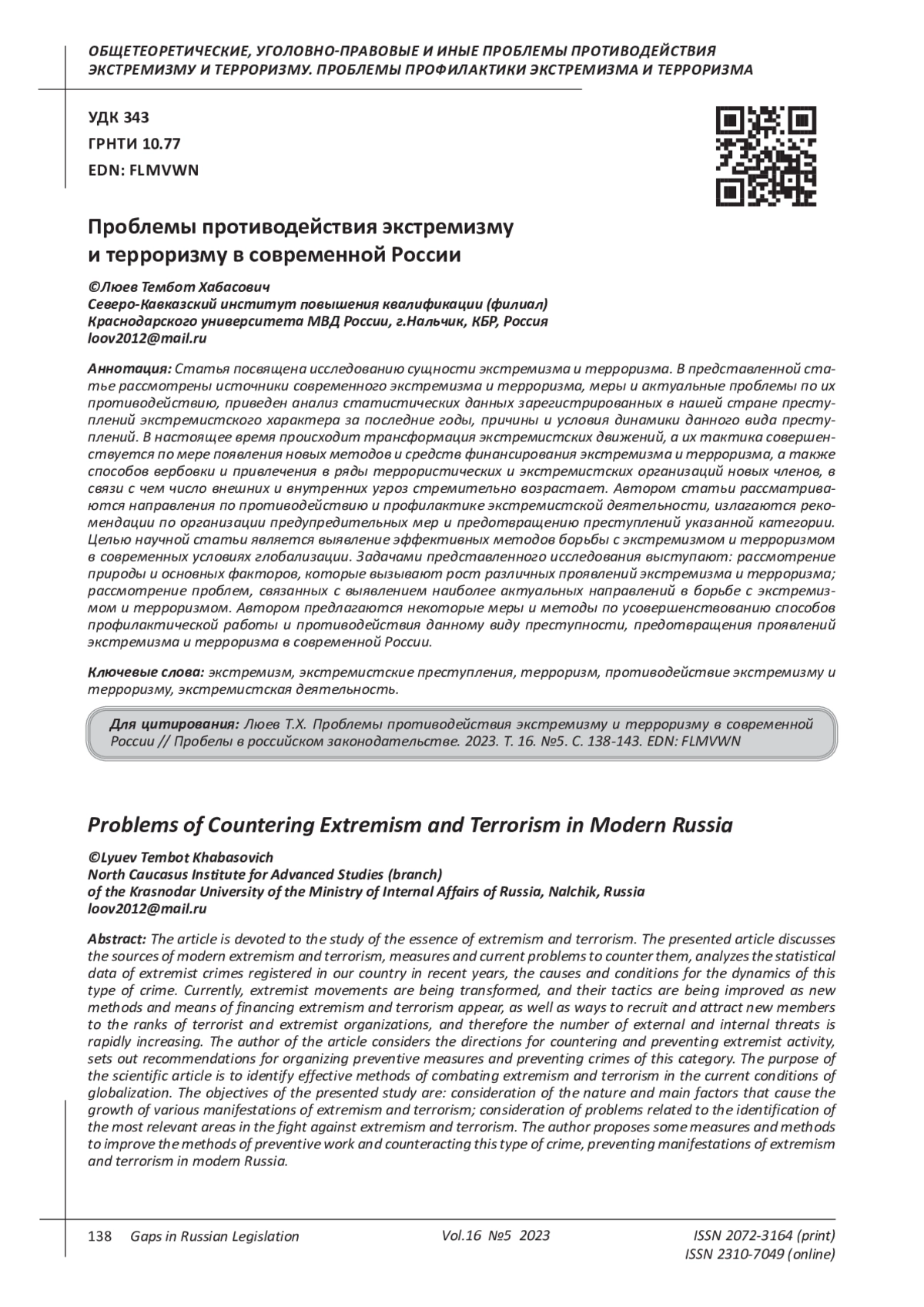 Lyuev T.Kh. Actual issues of prevention of terrorism among the youth // Gaps in Russian legislation. 2022. V. 15. No. 5. pp. 110-114. EDN: KWSSMO