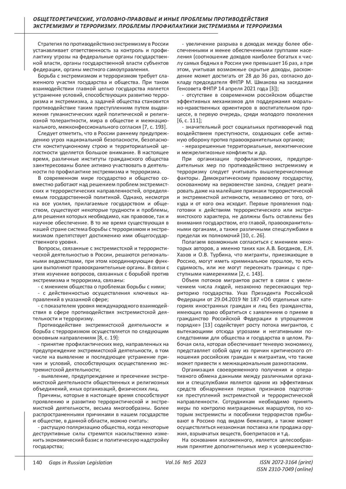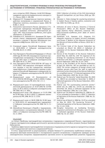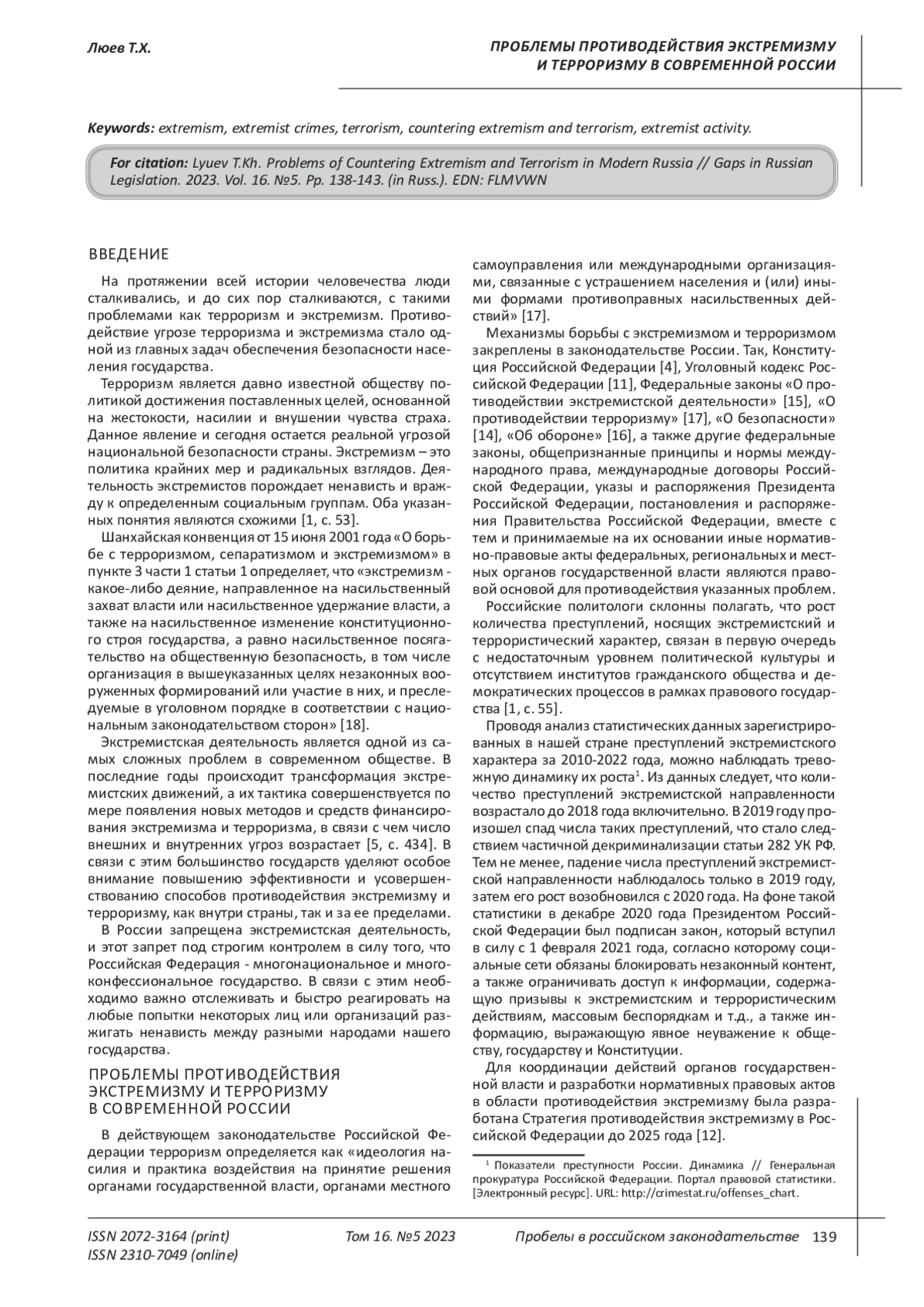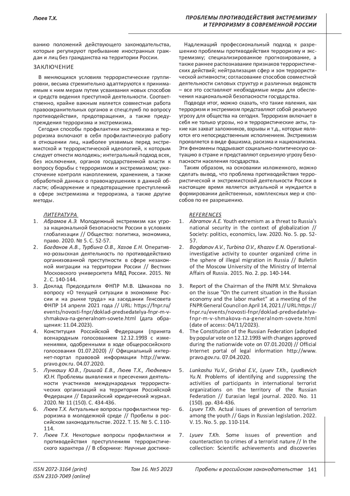 6. Люев Т.Х. Актуальные вопросы профилактики терроризма в молодежной среде // Пробелы в российском законодательстве. 2022. Т. 15. № 5. С. 110-114. EDN: KWSSMO