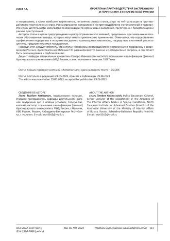 Lyuev T.Kh. Some issues of prevention and counteraction to crimes of a terrorist nature // In the collection: Scientific achievements and discoveries 2020. Collection of articles of the XVII International Research Competition: at 2 pm Penza. 2020. pp. 193-194. EDN: YOZZUV