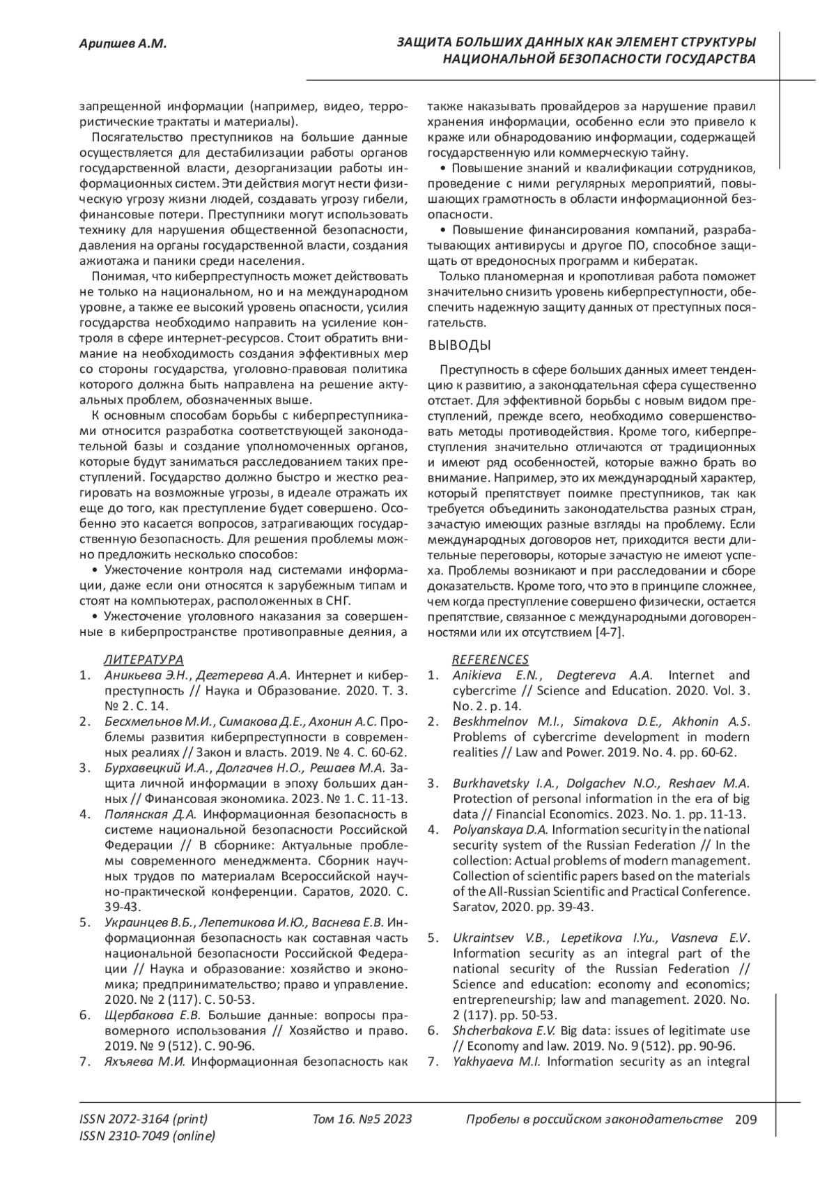 3. Бурхавецкий И.А., Долгачев Н.О., Решаев М.А. Защита личной информации в эпоху больших данных // Финансовая экономика. 2023. № 1. С. 11-13. EDN: CGCYST
