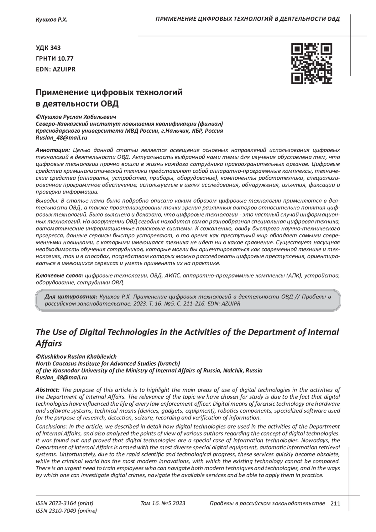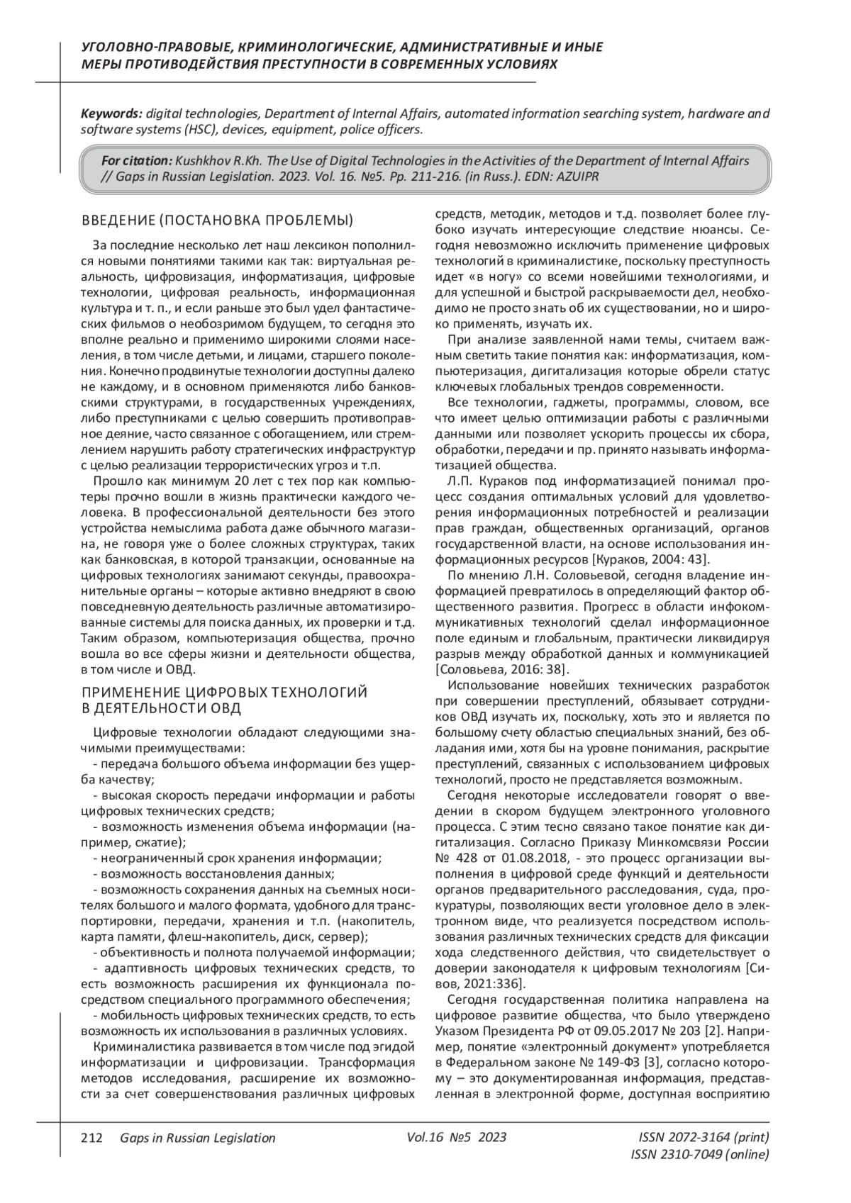 5. Колупаева Т.А. Использование информационных технологий в правоохранительной деятельности// Молодой ученый. - 2020. - № 22 (312). - С. 267-268. EDN: TNWNTE