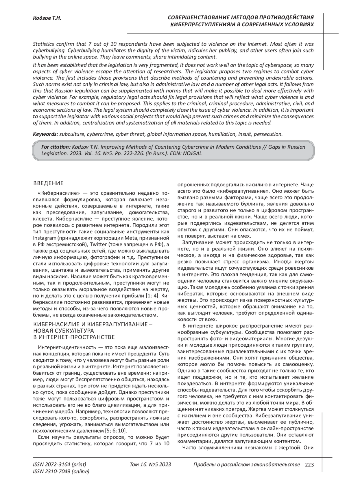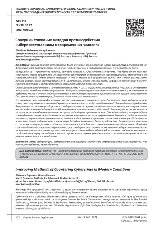 Целью данного исследования было изучение возникновения новых субкультур в глобальном информационном пространстве, связанных с кибернасилием и киберзапугиванием пользователей сети. Кибернасилие - преступное явление, которое появилось с развитием интернета. Породили этот тип преступности такие социальные инструменты как Instagram (принадлежит корпорации Meta, признанной в РФ экстремистской), Twitter (тоже запрещен в РФ), а также ряд социальных сетей, где можно выкладывать личную информацию, фотографии и т. д. Преступники стали использовать цифровые технологии для запугивания, шантажа и вымогательства, применять другие виды насилия. Статистическими данными подтверждается, что 7 из 10 опрошенных подвергались насилию в интернете. Чаще всего это было киберзапугивание. Киберзапугивание унижает достоинство жертвы, высмеивает ее публично, часто к таким издевательствам в онлайн-пространстве присоединяются другие пользователи. Они оставляют комментарии, делятся запугивающим контентом. Установлено, что законодательство весьма разрозненно, оно плохо прорабатывает тему киберпространства, поэтому многие аспекты кибернасилия ускользают из виду исследователей. Законодатель предлагает два режима, позволяющих бороться с кибернасилием. К первому относят те положения, в которых описаны методы противодействия и предотвращения нежелательных действий. Такие нормы есть не только в уголовном, но и в административном праве, ряде других правовых актов. Отсюда следует, что российское законодательство можно дополнить нормами, которые позволят эффективнее бороться с кибернасилием. Например, нормативно-правовые акты должны зафиксировать правовые положения, в которых будет отражено, что такое кибернасилие и какие меры борьбы с ним могут быть предложены. Это касается уголовного, уголовно-процессуального, административного, гражданского, экономического раздела права. Правовая система должна полностью закрывать вопрос о кибернасилии. Кроме того, важно поддержать законодателя различными социальными проектами, которые помогли бы предупреждать такого рода преступления и сводить к минимуму последствия от них. Кроме этого, нужна централизация и систематизация всех материалов, относящихся к этой теме.