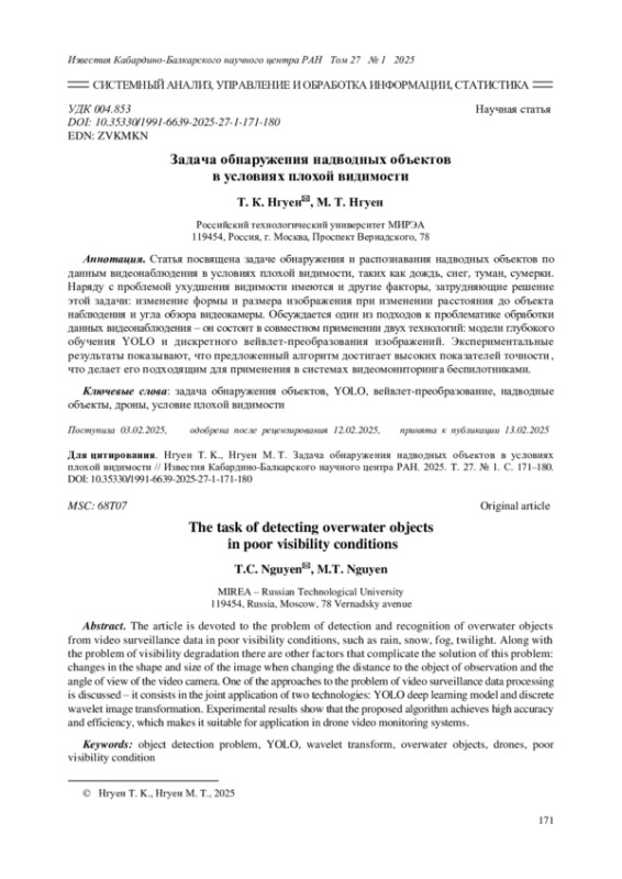 Статья посвящена задаче обнаружения и распознавания надводных объектов по данным видеонаблюдения в условиях плохой видимости, таких как дождь, снег, туман, сумерки. Наряду с проблемой ухудшения видимости имеются и другие факторы, затрудняющие решение этой задачи: изменение формы и размера изображения при изменении расстояния до объекта наблюдения и угла обзора видеокамеры. Обсуждается один из подходов к проблематике обработки данных видеонаблюдения - он состоит в совместном применении двух технологий: модели глубокого обучения YOLO и дискретного вейвлет-преобразования изображений. Экспериментальные результаты показывают, что предложенный алгоритм достигает высоких показателей точности, что делает его подходящим для применения в системах видеомониторинга беспилотниками.