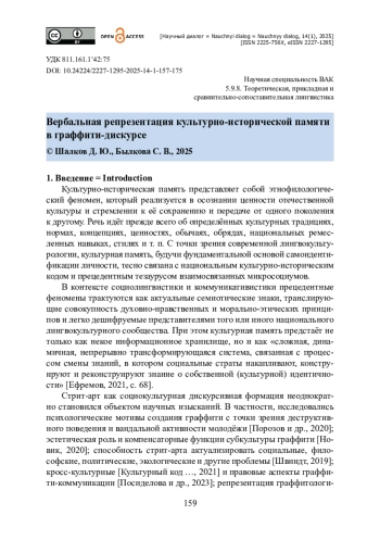 В статье рассматриваются некоторые способы вербальной репрезентации культурно-исторической памяти в граффити-дискурсе. Стрит-арт-объекты представлены как социокультурная дискурсивная формация, транслирующая определённые национальные концепты, духовно-нравственные ориентиры и морально-этические принципы. Цель настоящего исследования — рассмотреть разновидности прецедентных феноменов, используемых граффити-райтерами, и на основе полученных результатов предложить классификацию соответствующих вербальных стрит-арт-объектов. Материалом послужили более 200 граффити, содержащих различные интертекстуальные включения. Минимальной структурно-семантической единицей прецедентного феномена является интертекстема — собственно лингвистическое средство реализации интертекстуальных связей в конкретных текстовых условиях. Авторы приходят к выводу, что интертекстемы, которые базируются на историко-культурном материале различного качества, служат раскрытию коммуникативно-прагматических интенций и мировоззренческих целеустановок граффити-райтеров. Наполняя урбанистическое пространство особыми смыслами, графические стрит-арт-объекты не только поднимают актуальные социально-экономические проблемы, но и содержат умозаключения философского характера, а также включают контент, способствующий эффективной трансляции и сохранению национального культурно-исторического кода.
