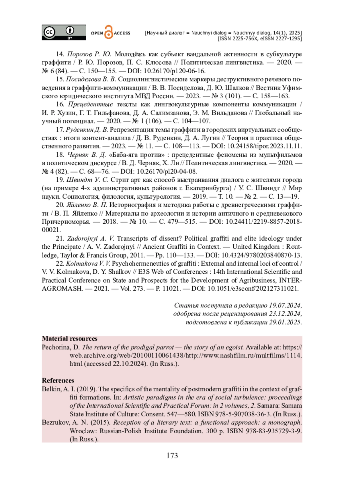 18. Руденкин Д. В. Репрезентация темы граффити в городских виртуальных сообществах : итоги контент-анализа / Д. В. Руденкин, Д. А. Лугин // Теория и практика общественного развития. - 2023. - № 11. - С. 108-113. - https://doi.org/10.24158/tipor.2023.11.11.