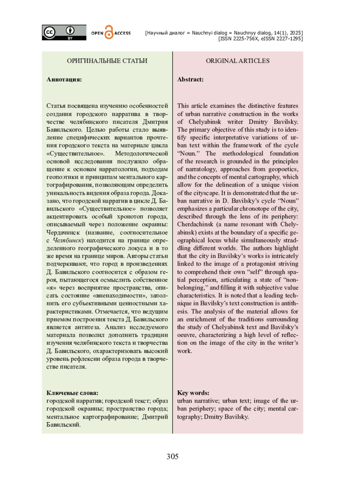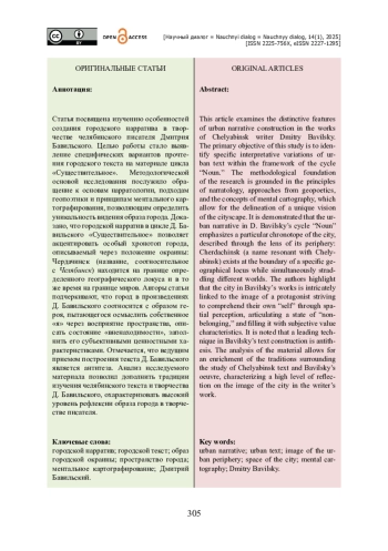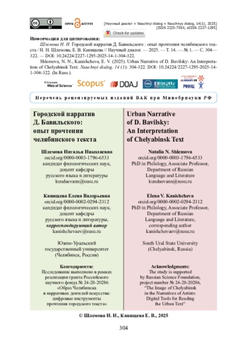 Статья посвящена изучению особенностей создания городского нарратива в творчестве челябинского писателя Дмитрия Бавильского. Целью работы стало выявление специфических вариантов прочтения городского текста на материале цикла «Существительное». Методологической основой исследования послужило обращение к основам нарратологии, подходам геопоэтики и принципам ментального картографирования, позволяющим определить уникальность видения образа города. Доказано, что городской нарратив в цикле Д. Бавильского «Существительное» позволяет акцентировать особый хронотоп города, описываемый через положение окраины: Чердачинск (название, соотносительное с Челябинск) находится на границе определенного географического локуса и в то же время на границе миров. Авторы статьи подчеркивают, что город в произведениях Д. Бавильского соотносится с образом героя, пытающегося осмыслить собственное «я» через восприятие пространства, описать состояние «вненаходимости», заполнить его субъетивными ценностными характеристиками. Отмечается, что ведущим приемом построения текста Д. Бавильского является антитеза. Анализ исследуемого материала позволил дополнить традиции изучения челябинского текста и творчества Д. Бавильского, охарактеризовать высокий уровень рефлексии образа города в творчестве писателя.