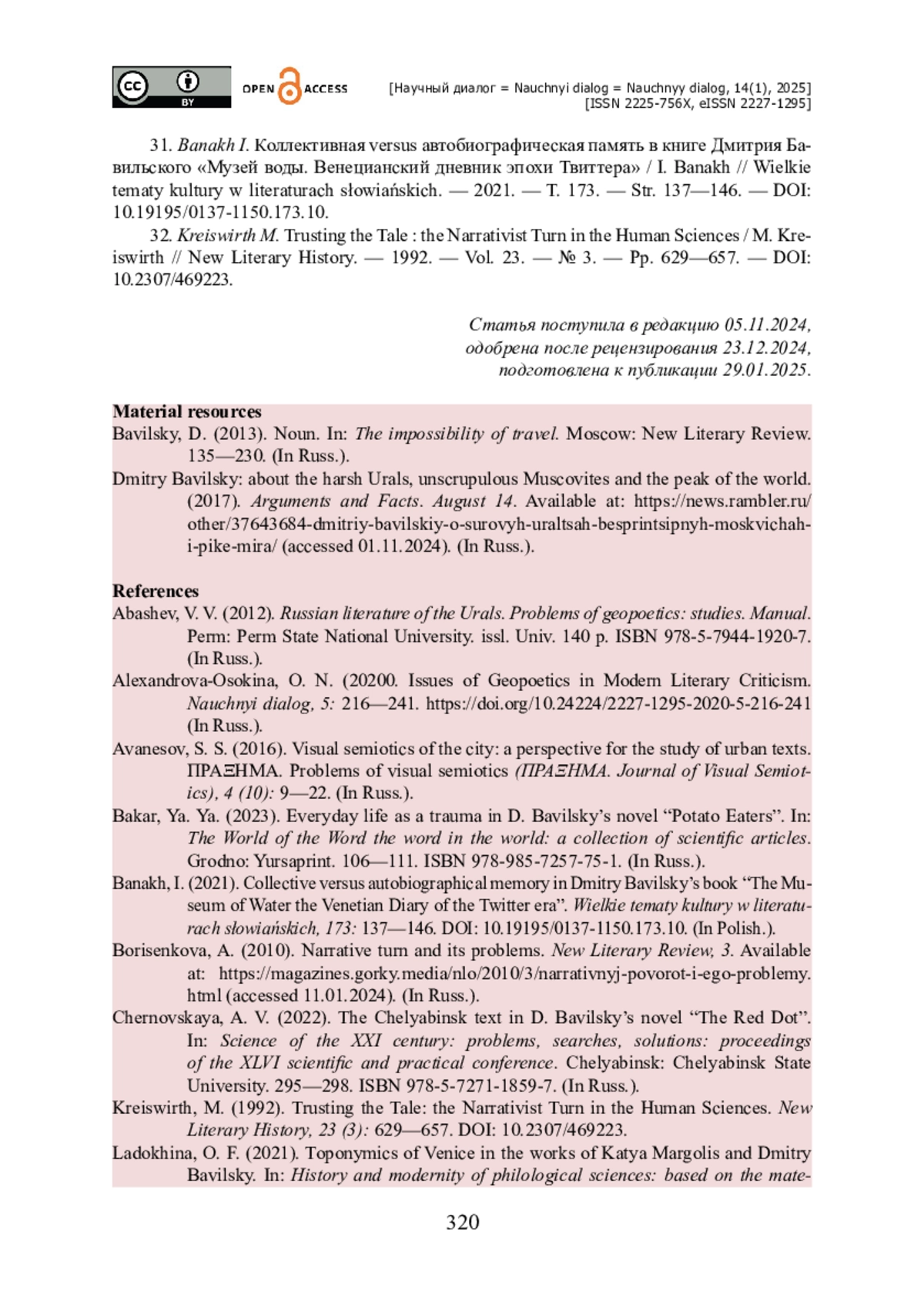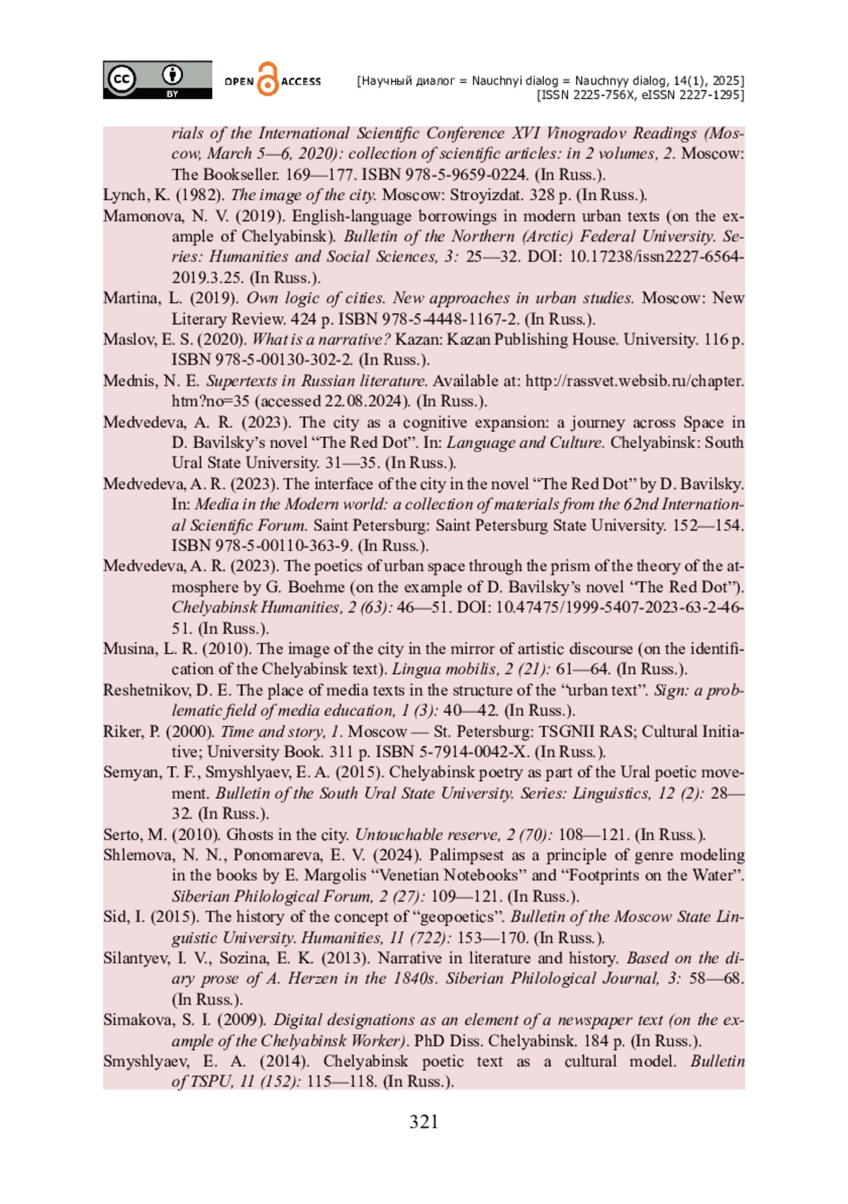 12. Медведева А. Р. Город как когнитивное расширение : путешествие поперек пространства в романе Д. Бавильского «Красная точка» // Язык и культура / гл. редактор В. Б. Мещеряков. - Челябинск : Южно-Уральский государственный университет, 2023. - С. 31-35.