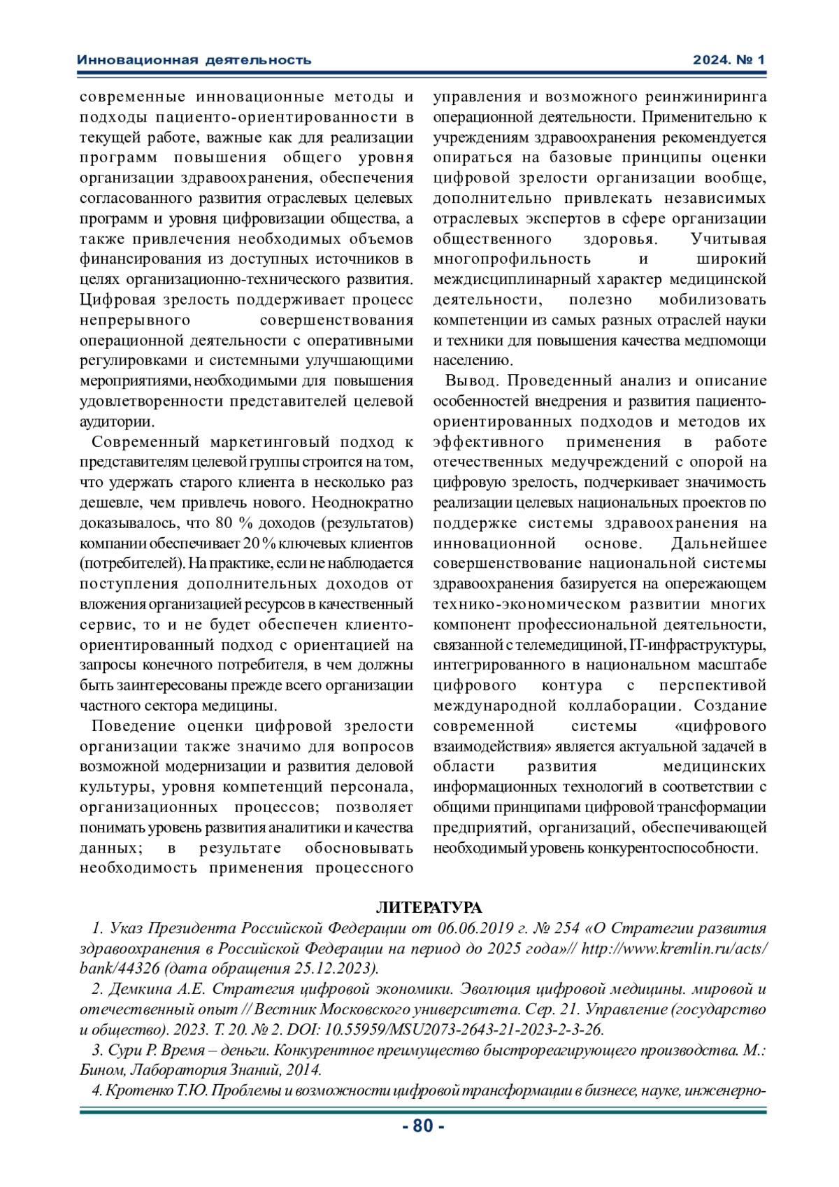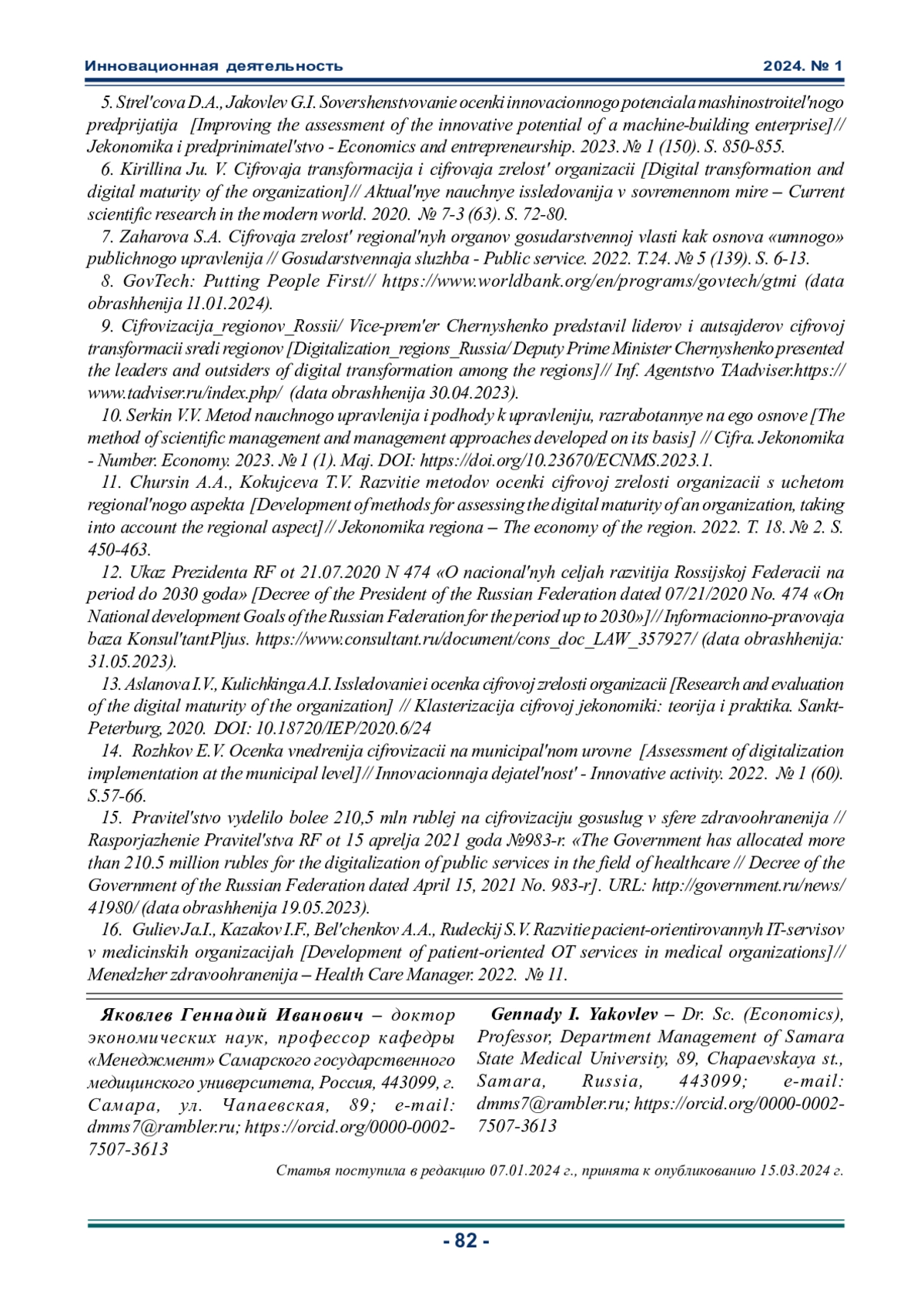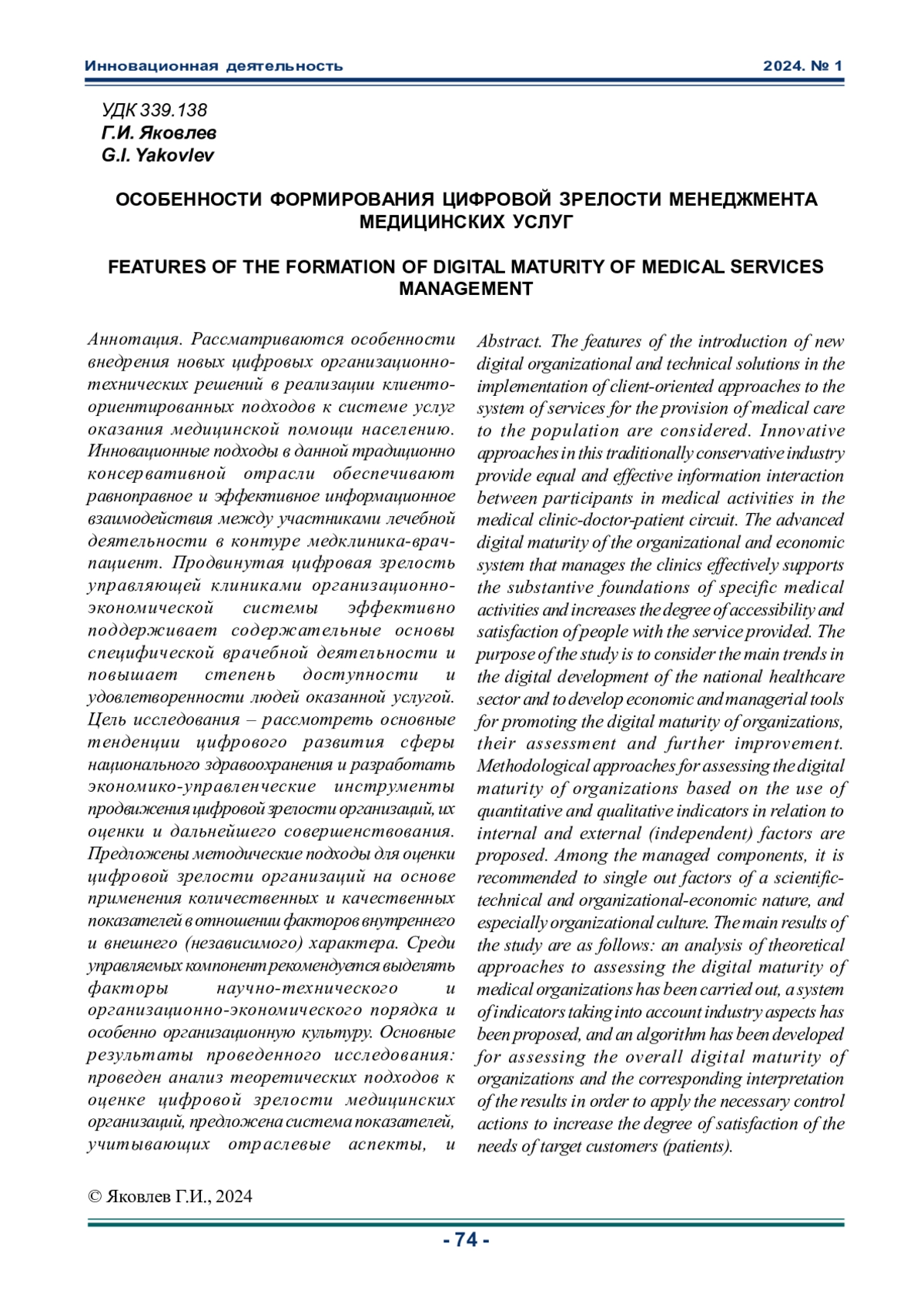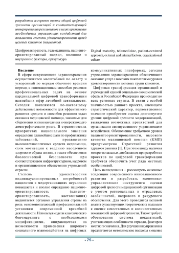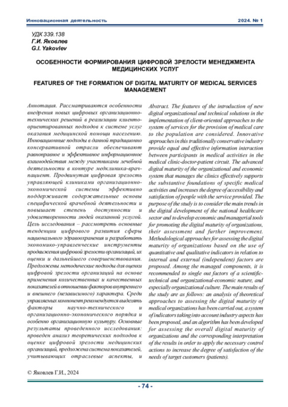 Рассматриваются особенности внедрения новых цифровых организационно- технических решений в реализации клиенто- ориентированных подходов к системе услуг оказания медицинской помощи населению. Инновационные подходы в данной традиционно консервативной отрасли обеспечивают равноправное и эффективное информационное взаимодействия между участниками лечебной деятельности в контуре медклиника-врач- пациент. Продвинутая цифровая зрелость управляющей клиниками организационно- экономической системы эффективно поддерживает содержательные основы специфической врачебной деятельности и повышает степень доступности и удовлетворенности людей оказанной услугой. Цель исследования - рассмотреть основные тенденции цифрового развития сферы национального здравоохранения и разработать экономико-управленческие инструменты продвижения цифровой зрелости организаций, их оценки и дальнейшего совершенствования. Предложены методические подходы для оценки цифровой зрелости организаций на основе применения количественных и качественных показателей вотношении факторов внутреннего и внешнего (независимого) характера. Среди управляемых компонент рекомендуется выделять факторы научно-технического и организационно-экономического порядка и особенно организационную культуру. Основные результаты проведенного исследования: проведен анализ теоретических подходов к оценке цифровой зрелости медицинских организаций, предложена система показателей, учитывающих отраслевые аспекты, и разработан алгоритм оценки общей цифровой зрелости организаций и соответствующей интерпретации результатов в целях применения необходимых управляющих воздействий для повышения степени удовлетворенности нужд целевых клиентов (пациентов).