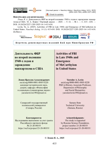 Статья посвящена переменам в политике Федерального бюро расследований (ФБР) США, связанным с началом Холодной войны. Отмечается, что президент Трумэн в отличие от своего предшественника Франклина Рузвельта совершенно иначе смотрел на деятельность Бюро, считал необходимым принудить эту службу к строгому соблюдению законов и иных правовых норм. Показано, что в условиях конфронтации с Белым домом директор ФБР Джон Эдгар Гувер идёт на сотрудничество с ультраконсервативными кругами обеих партий. Показано, что Гувером была инициирована кампания по борьбе с коммунистическим влиянием в США, реальная цель которой заключалась в фактическом обходе руководства страны для реализации ФБР своих целей. Отмечается, что в 1950 году у сторонников Гувера появляется лидер — сенатор Джозеф Маккарти. Сообщается, что быстро оформившееся движение «маккартистов» становится влиятельным и в альянсе с Бюро раздувает в Америке атмосферу подозрительности, чтобы привлечь к ответственности те лица и организации, которые федеральные агенты считали связанными с советской разведкой или «нелояльными». В рамках данной статьи проанализированы проблемы в отношениях ФБР и Белого дома. Охарактеризованы начало сотрудничества Бюро с радикал-консерваторами в Конгрессе и зарождение «маккартизма». Рассмотрено развитие общественной кампании по борьбе с коммунизмом. Проанализированы связанные с ней репрессии, а также влияние «потери» Китая на ход этой кампании и позицию президента.