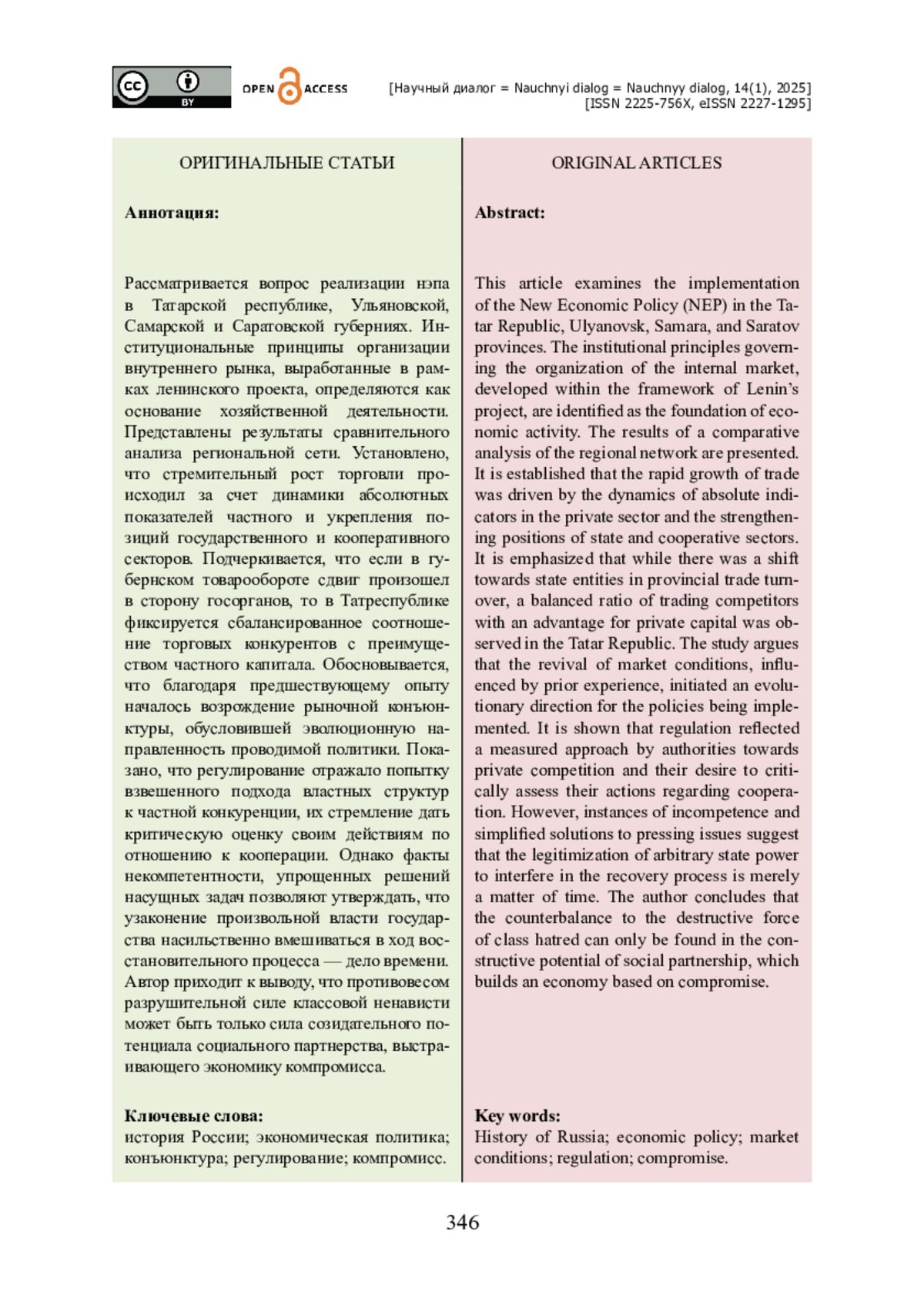 Рассматривается вопрос реализации нэпа в Татарской республике, Ульяновской, Самарской и Саратовской губерниях. Институциональные принципы организации внутреннего рынка, выработанные в рамках ленинского проекта, определяются как основание хозяйственной деятельности. Представлены результаты сравнительного анализа региональной сети. Установлено, что стремительный рост торговли происходил за счет динамики абсолютных показателей частного и укрепления позиций государственного и кооперативного секторов. Подчеркивается, что если в губернском товарообороте сдвиг произошел в сторону госорганов, то в Татреспублике фиксируется сбалансированное соотношение торговых конкурентов с преимуществом частного капитала. Обосновывается, что благодаря предшествующему опыту началось возрождение рыночной конъюнктуры, обусловившей эволюционную направленность проводимой политики. Показано, что регулирование отражало попытку взвешенного подхода властных структур к частной конкуренции, их стремление дать критическую оценку своим действиям по отношению к кооперации. Однако факты некомпетентности, упрощенных решений насущных задач позволяют утверждать, что узаконение произвольной власти государства насильственно вмешиваться в ход восстановительного процесса — дело времени. Автор приходит к выводу, что противовесом разрушительной силе классовой ненависти может быть только сила созидательного потенциала социального партнерства, выстраивающего экономику компромисса.