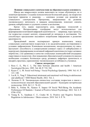 Голудин, И. А. Социальное самочувствие как фактор образовательной успешности подростков в условиях информационного общества / И. А. Голудин, А. А. Новичкова // Горизонты междисциплинарного знания: наука и практика в эпоху трансформаций : Сборник научных трудов по материалам Международной научно-практической конференции, Белгород, 15 июля 2025 года. – Белгород: ООО “Агентство перспективных научных исследований”, 2025. – С. 33-35. – EDN XMGQFK.