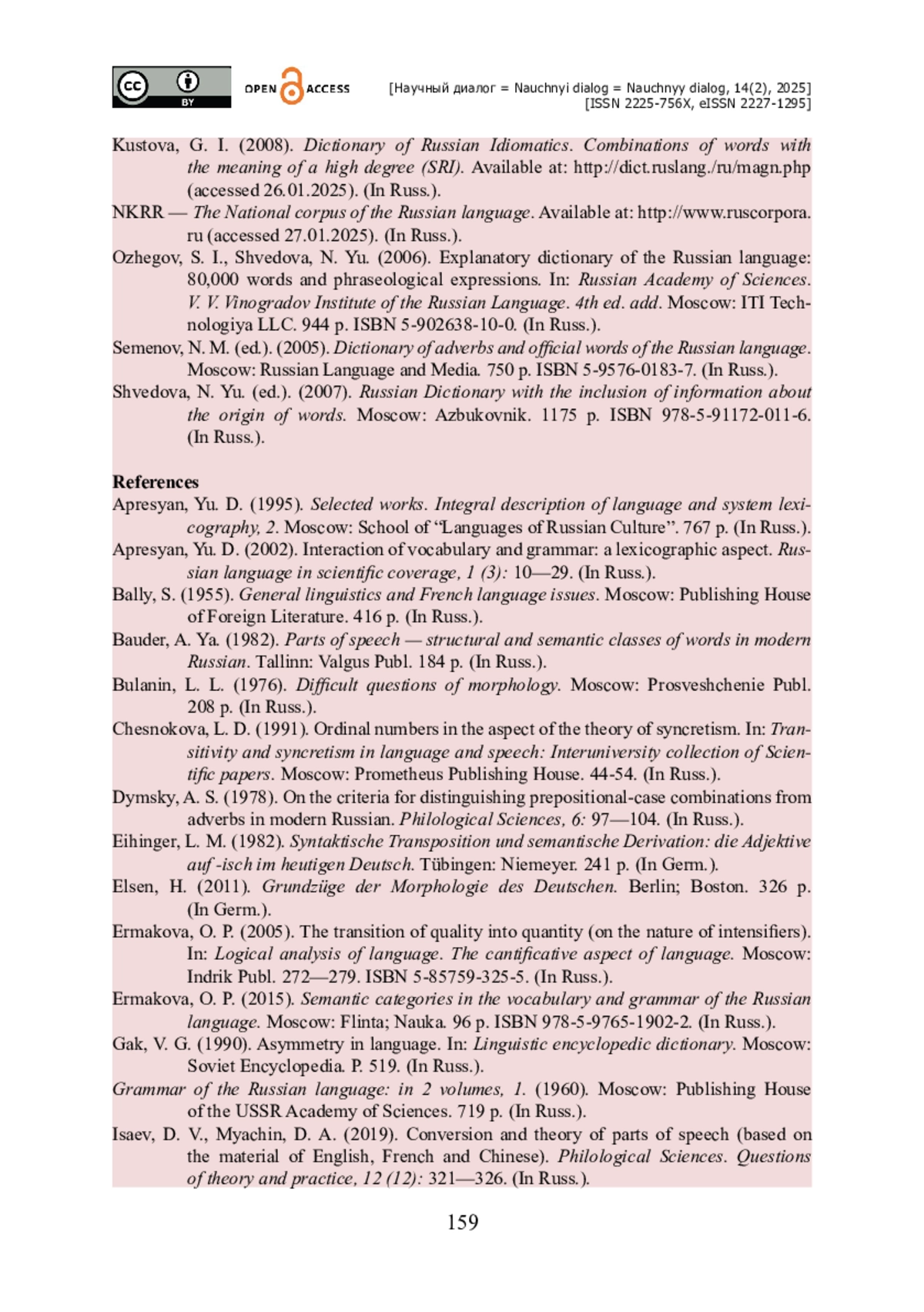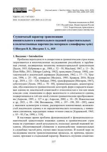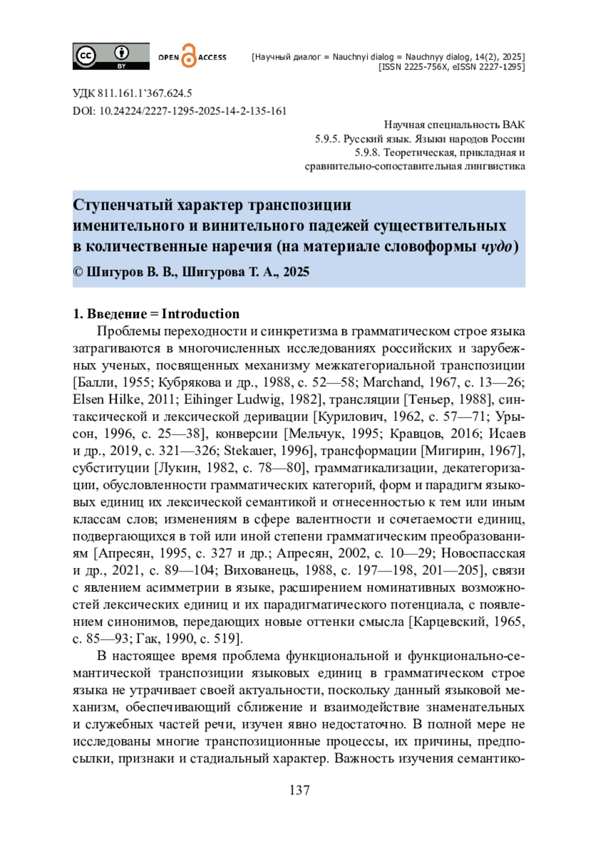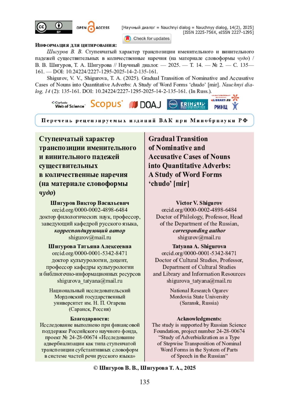 35. Шигуров В. В. Собственно грамматический тип ступенчатой транспозиции субстантивной словоформы рядом в подкласс наречий образа действия / В. В. Шигуров, Т. А. Шигурова // Научный диалог. - 2024. - Т. 13. - № 2. - С. 176-197. - https://doi.org/10.24224/2227-1295-2024-13-2-176-197.