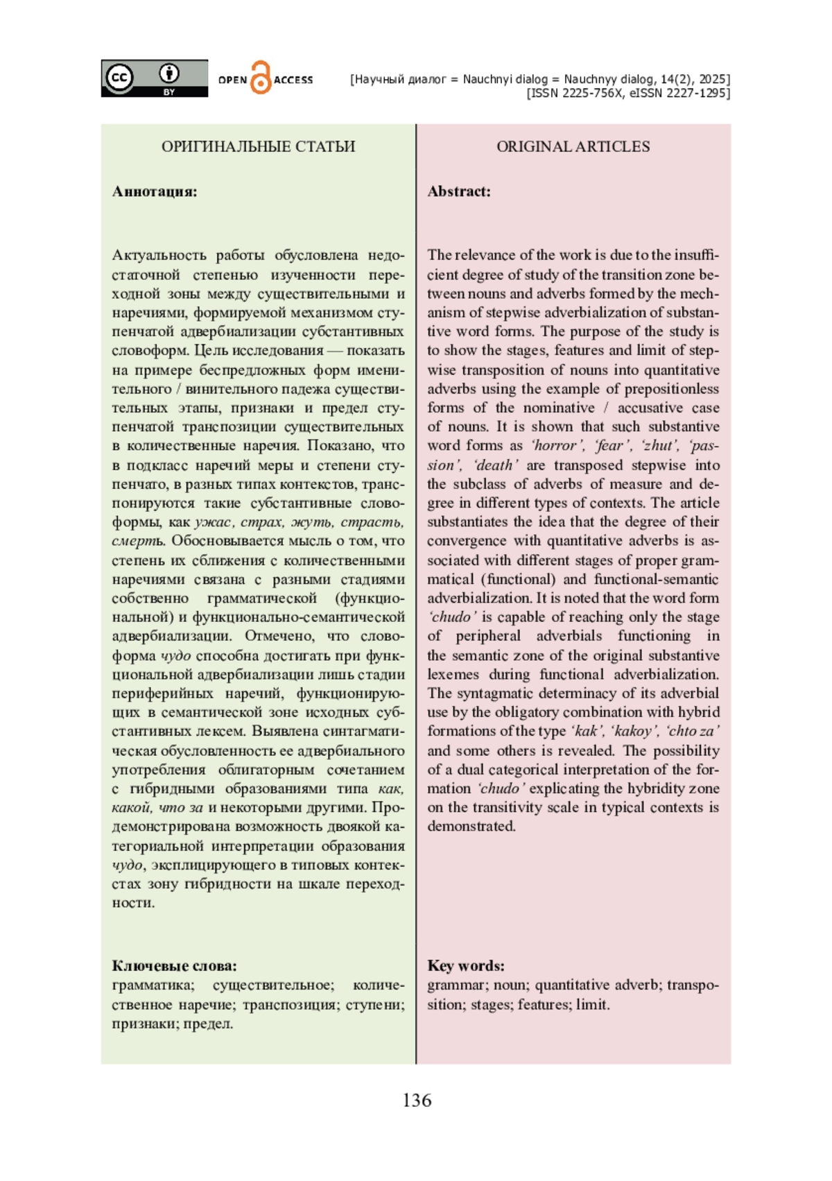 Актуальность работы обусловлена недостаточной степенью изученности переходной зоны между существительными и наречиями, формируемой механизмом ступенчатой адвербиализации субстантивных словоформ. Цель исследования — показать на примере беспредложных форм именительного / винительного падежа существительных этапы, признаки и предел ступенчатой транспозиции существительных в количественные наречия. Показано, что в подкласс наречий меры и степени ступенчато, в разных типах контекстов, транспонируются такие субстантивные словоформы, как ужас, страх, жуть, страсть, смерть. Обосновывается мысль о том, что степень их сближения с количественными наречиями связана с разными стадиями собственно грамматической (функциональной) и функционально-семантической адвербиализации. Отмечено, что словоформа чудо способна достигать при функциональной адвербиализации лишь стадии периферийных наречий, функционирующих в семантической зоне исходных субстантивных лексем. Выявлена синтагматическая обусловленность ее адвербиального употребления облигаторным сочетанием с гибридными образованиями типа как, какой, что за и некоторыми другими. Продемонстрирована возможность двоякой категориальной интерпретации образования чудо, эксплицирующего в типовых контекстах зону гибридности на шкале переходности.