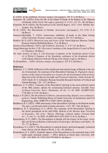 10. Красильникова Е. И. Символические фигуры декабристов в мемориальном пространстве Иркутска (начало ХХ в. - 1991 г.) / Е. И. Красильникова // Вестник Томского государственного университета. - 2021. - № 468. - С. 129-138. - https://doi.org/10.17223/15617793/468/14.