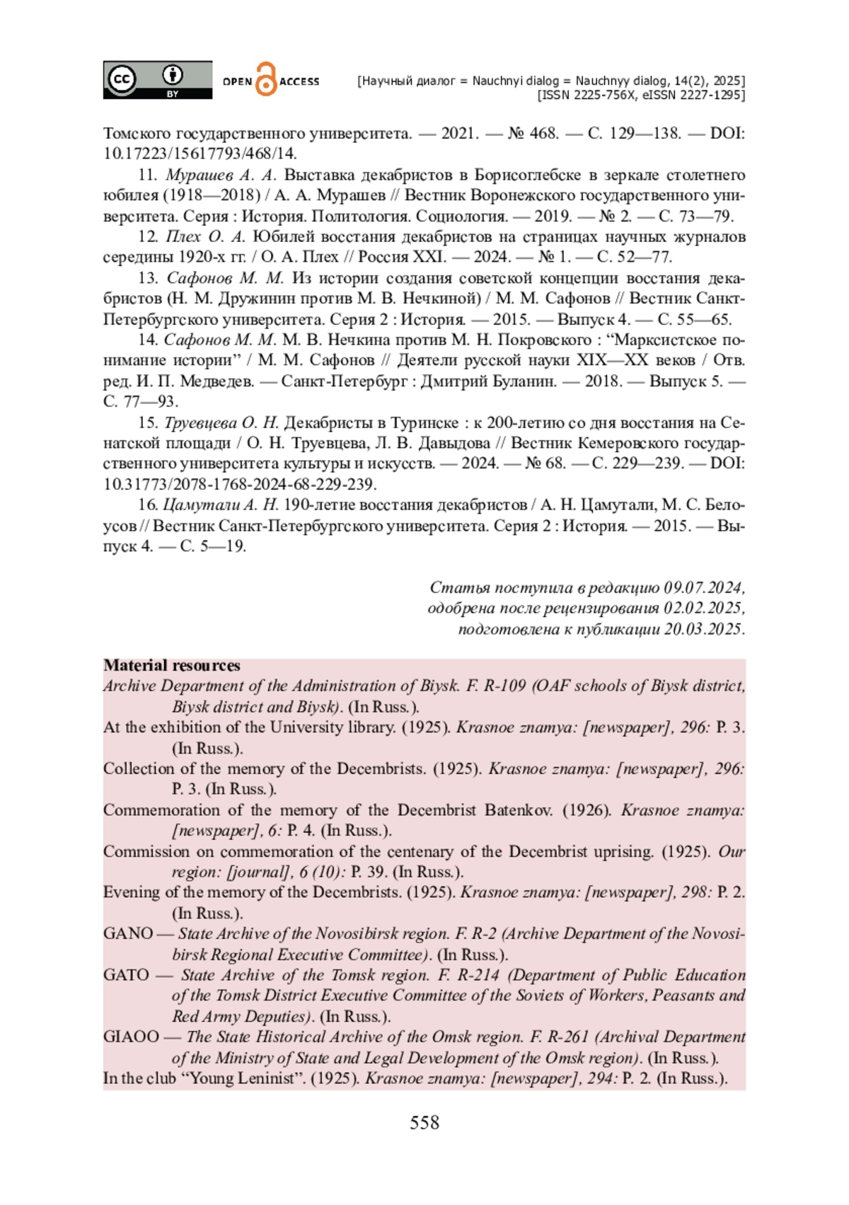 12. Плех О. А. Юбилей восстания декабристов на страницах научных журналов середины 1920-х гг. / О. А. Плех // Россия XXI. - 2024. - № 1. - С. 52-77.