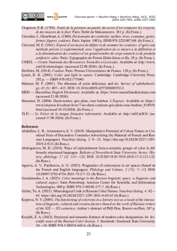7. Воробьева Е. Ю. Цветовая номинация как когнитивно-эмоциональная деятельность (на примере цветообозначений французского языка) / Е. Ю. Воробьева // Вестник Московского университета. Серия 19. Лингвистика и межкультурная коммуникация. - 2024. - Т. 27 - № 1. - C. 194-200. - https://doi.org/10.55959/MSU-2074-1588-19-27-1-14.