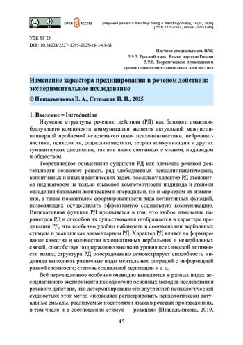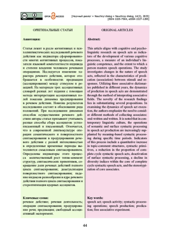Статья лежит в русле когнитивных и психолингвистических исследований речевого действия как индикатора сформированности многих когнитивных процессов, показателя языковой компетентности индивида и степени владения человеком речевыми операциями. Исследуется изменение характера речевого действия, которое отображается в особенностях предикации (ассоциирования) между стимулом и реакцией. На материале трех ассоциативных словарей разных лет издания с помощью метода интерпретации ассоциативных полей показана динамика предицирования в речевом действии. Новизна результатов исследования состоит в обосновании ряда положений. При исследовании динамики способов осуществления речевого действия авторы статьи призывают учитывать разные способы сбора ассоциатов: устно-письменный и письменный. Отмечается, что в современной лингвокультуре операции семантического и поверхностного синтаксирования в продуцировании речевого действия с разной интенсивностью в определенные временные периоды вытесняются смысловым синтаксированием. Определены индикаторы этого процесса количественный рост топик-коммент структур, синтаксических примитивов, сокращение доли речевых действий полного цикла синтаксирования; деактуализация поверхностного синтаксирования; падение индексов разнообразия в ядре речевого действия полного цикла синтаксирования и стереотипизация ядерных ассоциатов.