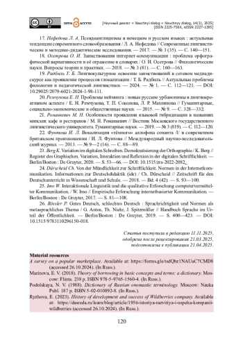17. Нефедова Л. А. Псевдоанглицизмы в немецком и русском языках : актуальные тенденции современного словообразования / Л. А. Нефедова // Современные лингвистические и методико-дидактические исследования. - 2017. - № 3 (35). - С. 140-151.