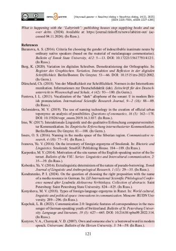 19. Радбиль Т. Б. Лингвокультурное освоение заимствований в сетевом медиадискурсе как проявление процессов глокализации / Т. Б. Радбиль // Актуальные проблемы филологии и педагогической лингвистики. - 2024. - № 1. - С. 112-121. - https://doi.org/10.29025/2079-6021-2024-1-98-111.