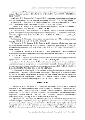 2. Дьячкова В. В., Коваленко Е. С. Современные цифровые инструменты в управлении закупками промышленного предприятия // Направления повышения эффективности управленческой деятельности органов государственной власти и местного самоуправления: Сборник материалов V Международной научно-практической конференции, Алчевск, декабря 2022 года. Алчевск: Луганский государственный университет имени Владимира Даля, 2023. С. 387-390. EDN: KPRAQC