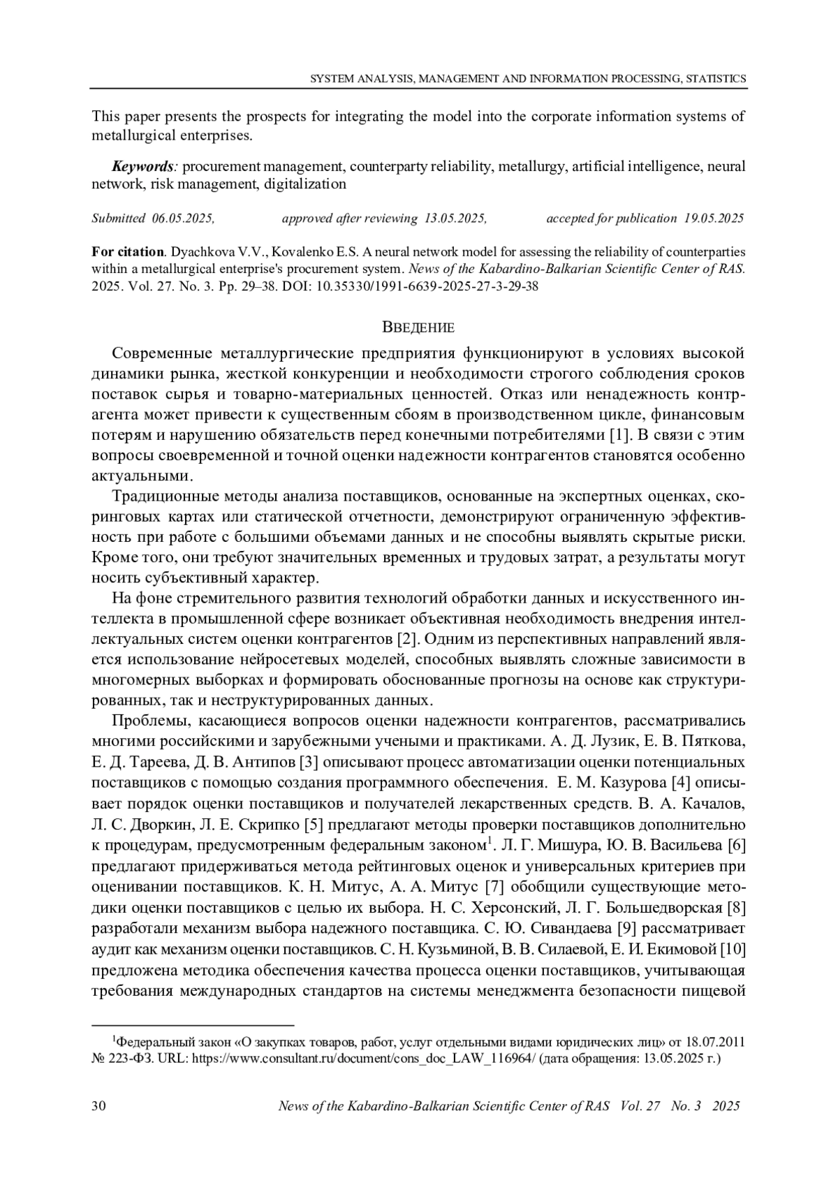 Результаты. В рамках исследования произведены сбор, анализ и обработка релевантных данных, проведен комплексный анализ параметров, характеризующих поставщиков, включая финансовые, юридические, операционные, организационные и репутационные показатели, построена архитектура модели, выполнены ее обучение и проверка на тестовой выборке, а также осуществлено сравнение с традиционными подходами оценки. Результаты тестирования модели показали высокую точность прогнозирования и подтвердили целесообразность ее применения в условиях информационной неопределенности. Представлены перспективы интеграции модели в корпоративные информационные системы металлургических предприятий.