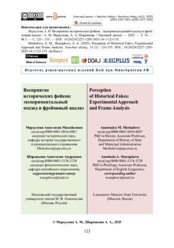 26. Шарапкова А. А. Фейки в контексте взаимодействия исторического знания с языковыми и мыслительными структурами : междисциплинарная модель / А. А. Шарапкова, А. М. Меркулова // Научный диалог. - 2023. - Т. 12 (2). - С. 157-187. - https://doi.org/10.24224/2227-1295-2023-12-2-157-187.