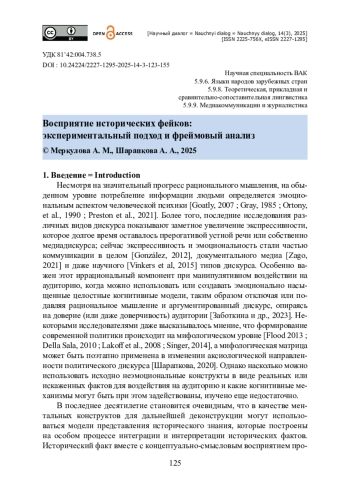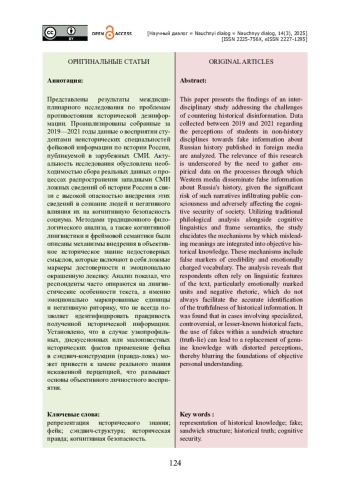 Представлены результаты междисциплинарного исследования по проблемам противостояния исторической дезинформации. Проанализированы собранные за 2019—2021 годы данные о восприятии студентами неисторических специальностей фейковой информации по истории России, публикуемой в зарубежных СМИ. Актуальность исследования обусловлена необходимостью сбора реальных данных о процессах распространения западными СМИ ложных сведений об истории России в связи с высокой опасностью внедрения этих сведений в сознание людей и негативного влияния их на когнитивную безопасность социума. Методами традиционного филологического анализа, а также когнитивной лингвистики и фреймовой семантики были описаны механизмы внедрения в объективное историческое знание недостоверных смыслов, которые включают в себя ложные маркеры достоверности и эмоционально окрашенную лексику. Анализ показал, что респонденты часто опираются на лингвистические особенности текста, а именно эмоционально маркированные единицы и негативную риторику, что не всегда позволяет идентифицировать правдивость полученной исторической информации. Установлено, что в случае узкопрофильных, дискуссионных или малоизвестных исторических фактов применение фейка в сэндвич-конструкции (правда-ложь) может привести к замене реального знания искаженной перцепцией, что размывает основы объективного личностного восприятия.