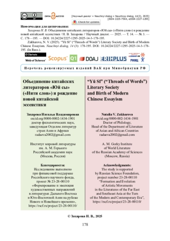 5. Ван Лицзюнь. Культура Чжэцзяна и эссе литераторов «Юй си» / Ван Лицзюнь // «Научные записки Чжэцзянского института гуманитарных и естественных наук». - 2020. - № 40 (3). - С. 1-10. (王黎君. 绍兴文理学院 /王黎君 // 浙江王黎君.越文化视阈下的语丝散文研究[J]. 绍兴文理学院学报 - 2020. - 40 (3). 1-10页).