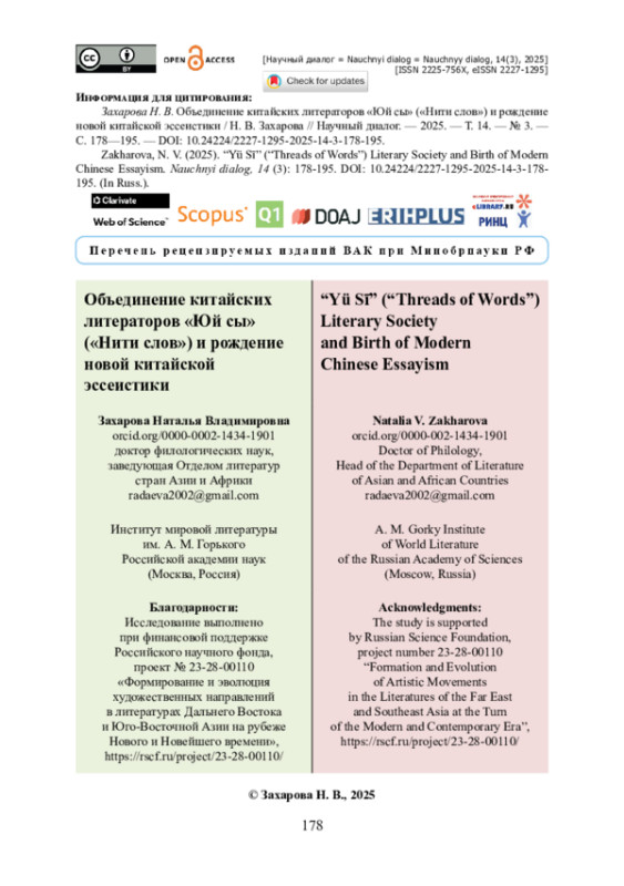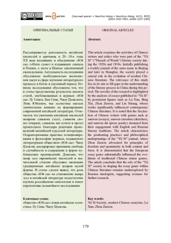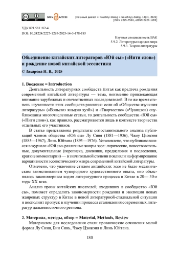 Рассматривается деятельность китайских писателей и критиков, в 20—30-е годы ХХ века входивших в объединение «Юй сы» («Нити слов») и издававших сначала в Пекине, а затем в Шанхае одноименный еженедельник. Актуальность исследования обусловлена необходимостью восполнения лакун в сфере изучения литературного процесса в Китае в указанный период. Новизна исследования обусловлена тем, что в статье представлены результаты анализа статей, опубликованных в журнале «Юй сы» Лу Синем, Бин Синь, Чжоу Цзожэнем, Линь Юйтанем, чья эссеистика оказала значительное влияние на формирование современной китайской литературы. Отмечается, что увлечение китайских писателей жанрами саньвэнь (эссе), саньвэнь сяошо (очерки), саньвэнь ши (стихи в прозе) происходило благодаря рецепции произведений английской и русской литературы. Охарактеризована практика позиционирования и философии журнала, издаваемого литературным обществом «Юй сы»: Чжоу Цзожэнь декларировал принципы свободы и случайности в содержании и форме публикуемых произведений. Доказано, что жанр эссе европейских писателей в значительной степени обусловил эволюцию традиционных китайских жанров малой формы. В статье сделан вывод, что роль общества «Юй сы» на становление жанра эссе в китайской литературе недостаточно изучена российскими синологами и имеет перспективы дальнейшего исследования.