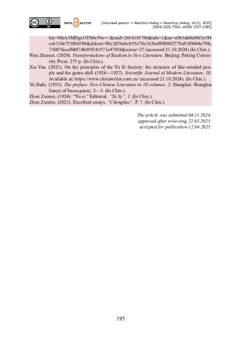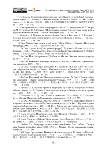 18. Ся Янь. О принципах общества «Юй сы» : структура единомышленников и жанровое смещение (1924-1927) [Электронный ресурс] / Ся Янь // Научный журнал современной литературы. - 2021. - № 10. - Режим доступа : https://www.chinawriter.com.cn (дата обращения 21.10.2024) (夏寅. 想象《语丝》的方式:同人结构与文体偏移(1924-1927. 现代文学学报. - 2021. - № 10).