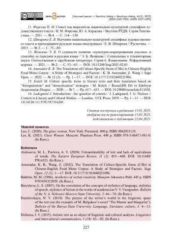 14. Amenador K. B. The Translation of Culture-Specific Items (CSIs) in Chinese-English Food Menu Corpus : A Study of Strategies and Factors / K. B. Amenador, Z. Wang // Sage Open. - 2022. - № 12 (2). - Pp. 1-17. - https://doi.org/10.1177/21582440221096.