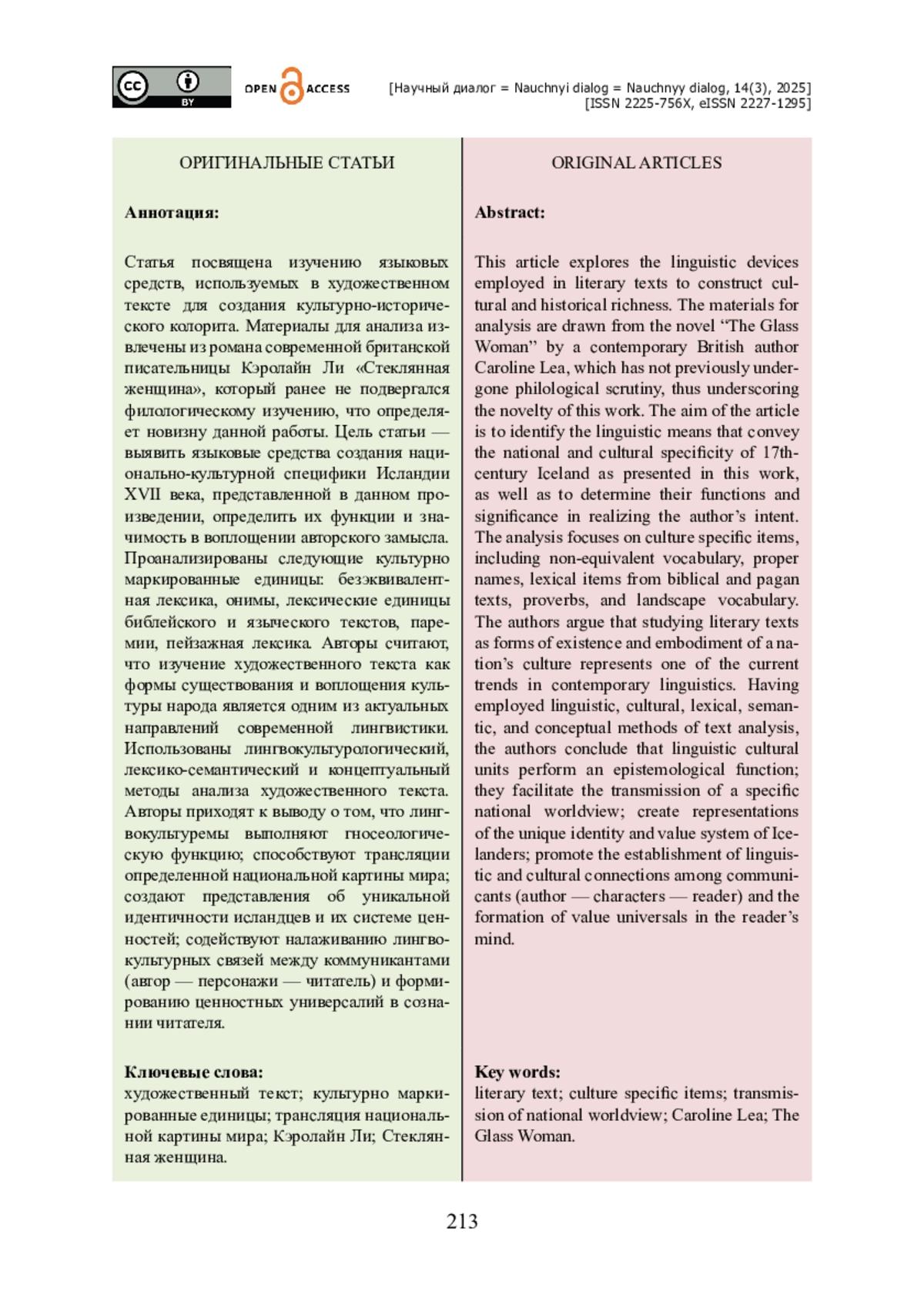 Статья посвящена изучению языковых средств, используемых в художественном тексте для создания культурно-исторического колорита. Материалы для анализа извлечены из романа современной британской писательницы Кэролайн Ли «Стеклянная женщина», который ранее не подвергался филологическому изучению, что определяет новизну данной работы. Цель статьи — выявить языковые средства создания национально-культурной специфики Исландии XVII века, представленной в данном произведении, определить их функции и значимость в воплощении авторского замысла. Проанализированы следующие культурно маркированные единицы: безэквивалентная лексика, онимы, лексические единицы библейского и языческого текстов, паремии, пейзажная лексика. Авторы считают, что изучение художественного текста как формы существования и воплощения культуры народа является одним из актуальных направлений современной лингвистики. Использованы лингвокультурологический, лексико-семантический и концептуальный методы анализа художественного текста. Авторы приходят к выводу о том, что лингвокультуремы выполняют гносеологическую функцию; способствуют трансляции определенной национальной картины мира; создают представления об уникальной идентичности исландцев и их системе ценностей; содействуют налаживанию лингвокультурных связей между коммуникантами (автор — персонажи — читатель) и формированию ценностных универсалий в сознании читателя.