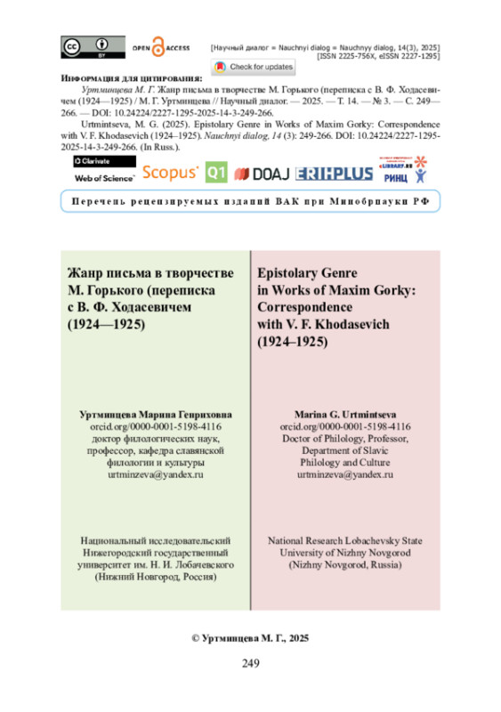 Статья посвящена исследованию особенностей жанра письма в эпистолярном наследии М. Горького 1924—1925 годов. Это период наиболее активного творческого общения с В. Ходасевичем, видным представителем русской культурной эмиграции. Цель статьи — показать, что письма М. Горького В. Ходасевичу — творческий акт, рождающийся в процессе недолгого эпистолярного общения корреспондентов. Представлены результаты анализа, в ходе которого было доказано, что рассматриваемые письма Горького представляют собой индивидуальную жанровую структуру. Представлена авторская разработка исследования жанра как динамической структуры, обладающей как устойчивыми сюжетно-композиционными приемами, так и вариативными способами апелляции к адресату, отражающими индивидуальность творческого процесса создания письма. В исследовании показано, что комплекс использованных в письмах Горького способов создания текста обусловлен особенностями личности участников, характером эпохи и обстоятельствами, в которых осуществляется переписка. Установлены устойчивые формулы эпистолярного общения М. Горького с В. Ходасевичем, сложившиеся в ходе обсуждения вопросов публикационной политики журнала «Беседа». Новизна исследования определяется доказательством многофункциональности этикетных приемов письменного диалога, ассоциативной обусловленностью сюжетной динамики, использованием различных видов сверхтекста, ориентацией на восприятие текста адресатом.