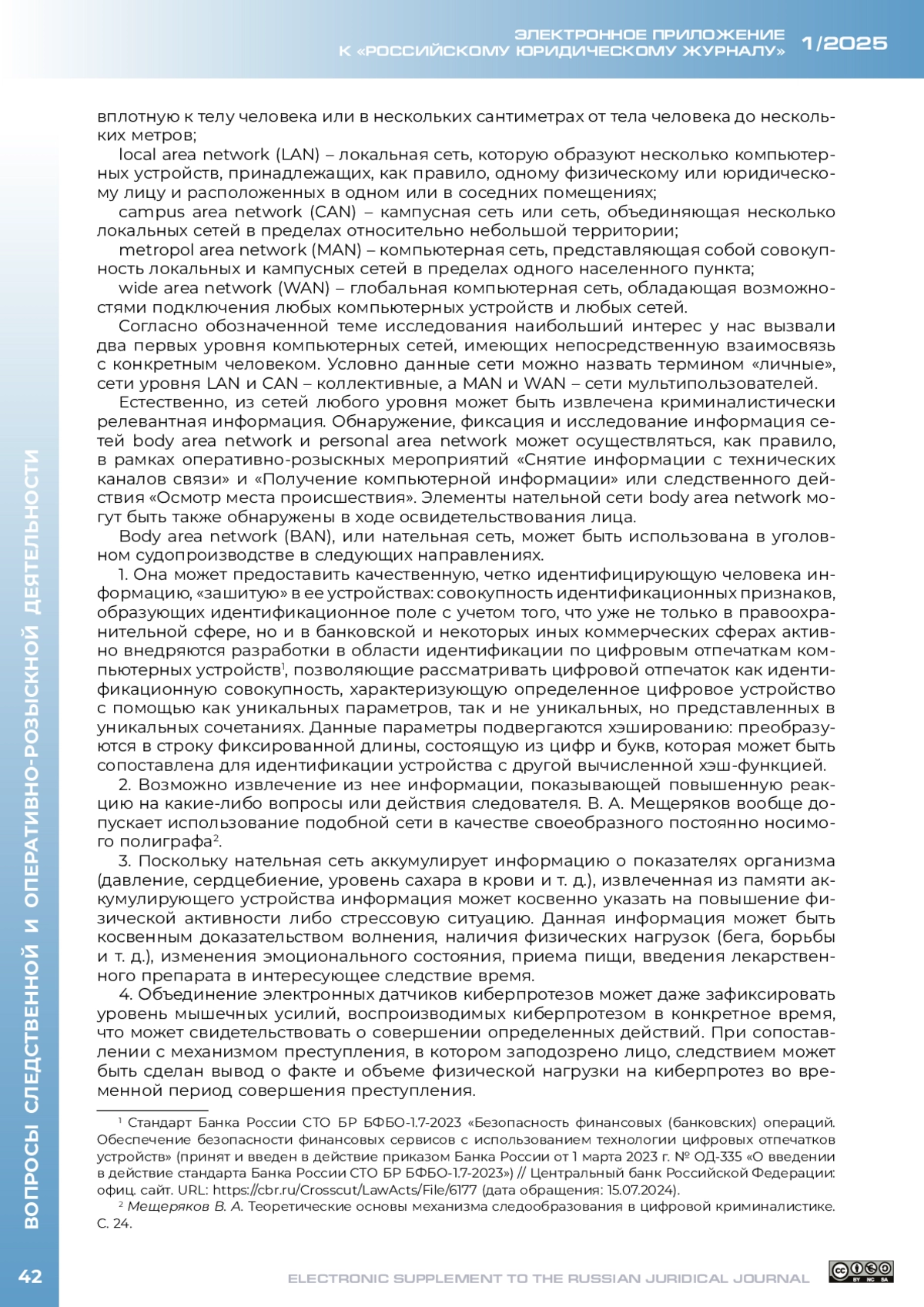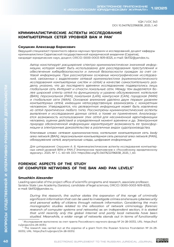 Автор констатирует расширение спектра криминалистически значимой информации, которая может быть использована для расследования преступлений и обеспечения кибербезопасности и личной безопасности граждан за счет сетевой информации. При рассмотрении основных монографических исследований, связанных с выделением сетевой криминалистики (криминалистического исследования компьютерных систем и сетей) в качестве самостоятельного раздела, указано, что до последнего времени исследованию подвергались лишь глобальная сеть Интернет и отчасти локальные сети. Между тем выделяется более широкий спектр сетей по функционалу и уровню обслуживания: нательная (BAN), персональная (PAN), локальная (LAN), кампусная (CAN), городская (MAN) и глобальная сети (WAN). Основное внимание уделено двум первым уровням компьютерных сетей, имеющим непосредственную взаимосвязь с конкретным человеком. Утверждается, что релевантная информация может быть извлечена из сетей практически любого типа. Рассмотрены криминалистические аспекты выявления и исследования данных сетей, а также их применения. Анализируется возможность использования этих сетей для несомненной идентификации человека, оценки действий в определенный момент времени и др. Электронная природа обозначенной информации характеризует возможность ее трансформации в электронные доказательства в различных видах судопроизводства.