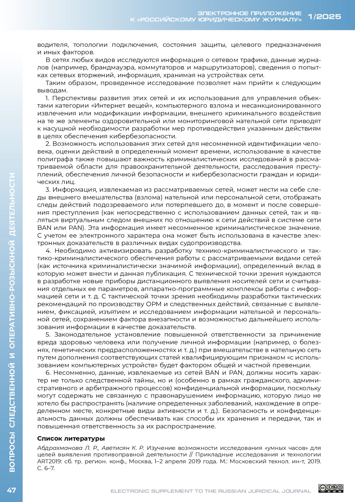 1. Абдрахманова Л. Р., Аветисян К. Р. Изучение возможности исследования “умных часов” для целей выявления противоправной деятельности // Прикладные исследования и технологии ART2019: сб. тр. регион. конф., Москва, 1-2 апреля 2019 года. М.: Московский технол. ин-т, 2019. С. 6-7. EDN: ZBAJSX