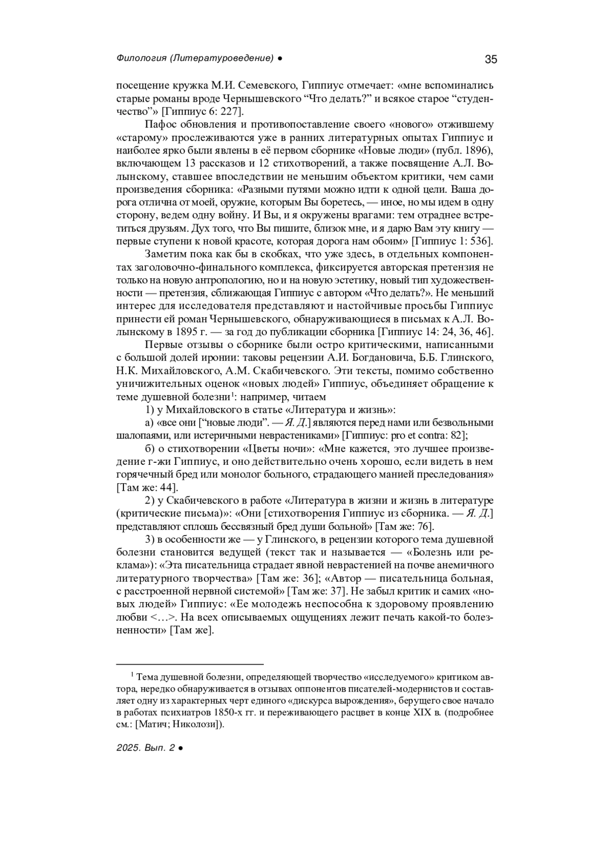 Magomedova D. M. Rewriting the “New People” Plot in the Russian Fiction at the End of the 19th and the Beginning of the 20th Centuries (V.V. Veresayev and Z.N. Gippius), Novyi filologicheskii Vestnik, 2018, no. 2, vol. 45, pp. 118-127. - In Russ.