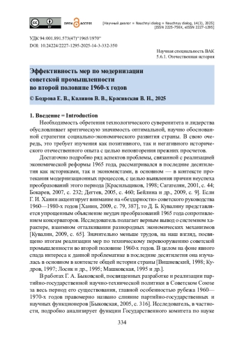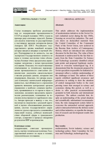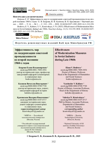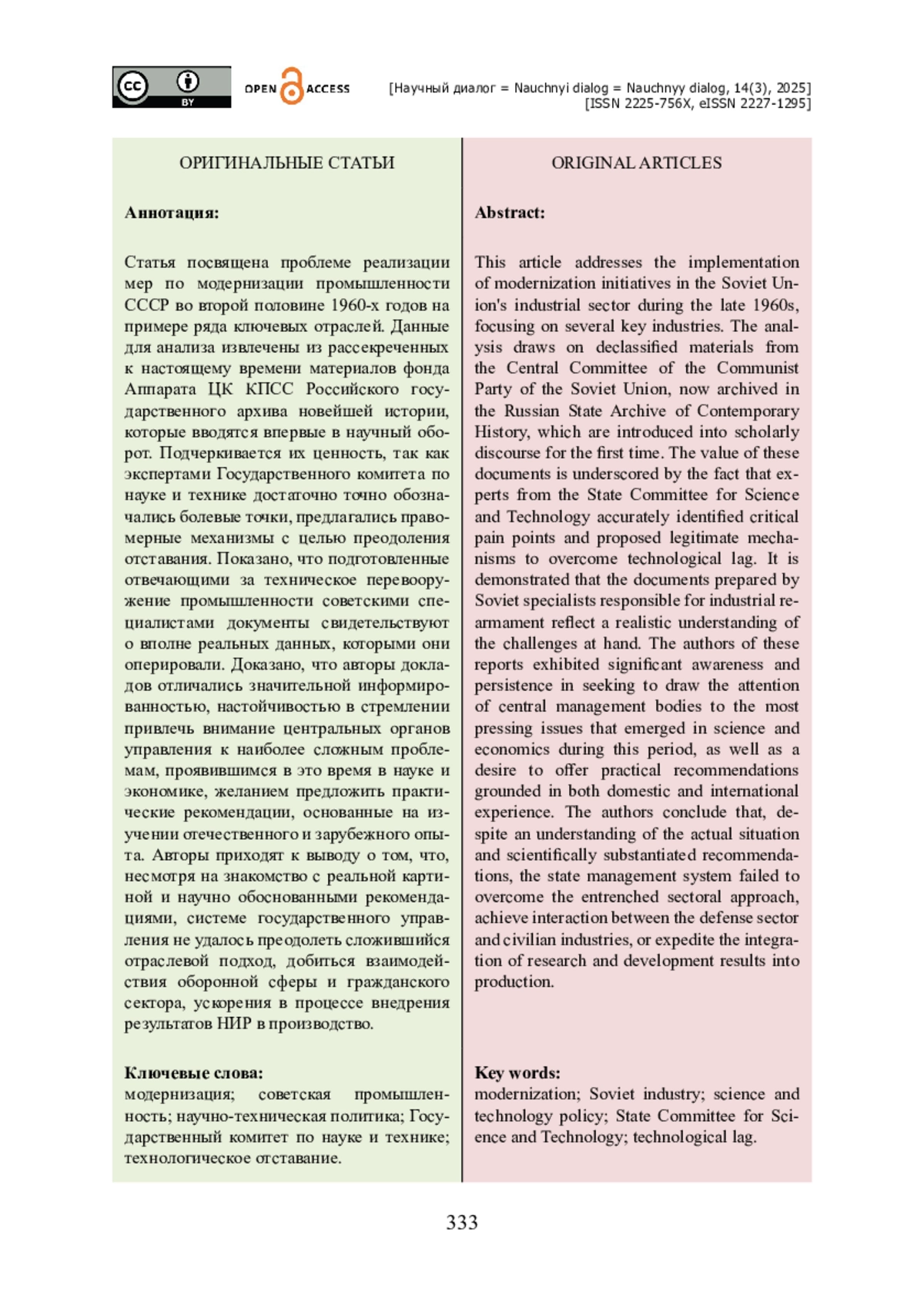 Статья посвящена проблеме реализации мер по модернизации промышленности СССР во второй половине 1960-х годов на примере ряда ключевых отраслей. Данные для анализа извлечены из рассекреченных к настоящему времени материалов фонда Аппарата ЦК КПСС Российского государственного архива новейшей истории, которые вводятся впервые в научный оборот. Подчеркивается их ценность, так как экспертами Государственного комитета по науке и технике достаточно точно обозначались болевые точки, предлагались правомерные механизмы с целью преодоления отставания. Показано, что подготовленные отвечающими за техническое перевооружение промышленности советскими специалистами документы свидетельствуют о вполне реальных данных, которыми они оперировали. Доказано, что авторы докладов отличались значительной информированностью, настойчивостью в стремлении привлечь внимание центральных органов управления к наиболее сложным проблемам, проявившимся в это время в науке и экономике, желанием предложить практические рекомендации, основанные на изучении отечественного и зарубежного опыта. Авторы приходят к выводу о том, что, несмотря на знакомство с реальной картиной и научно обоснованными рекомендациями, системе государственного управления не удалось преодолеть сложившийся отраслевой подход, добиться взаимодействия оборонной сферы и гражданского сектора, ускорения в процессе внедрения результатов НИР в производство.