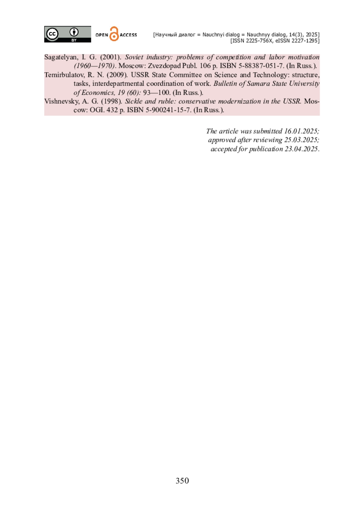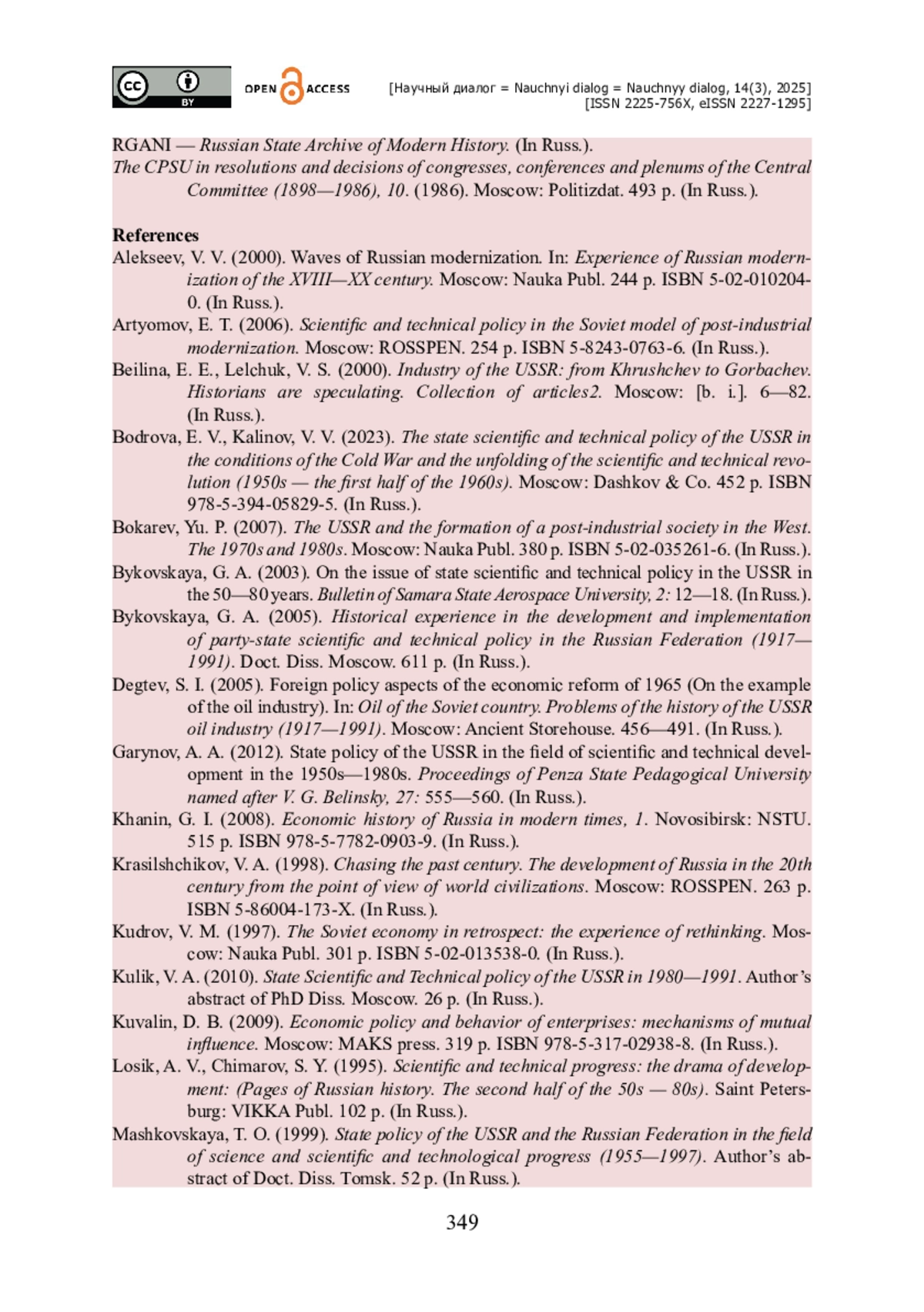 7. Быковская Г. А. К вопросу о государственной научно-технической политике в СССР в 50-80 годы / Г. А. Быковская // Вестник Самарского государственного аэрокосмического университета. - 2003. - № 2. - С. 12-18.