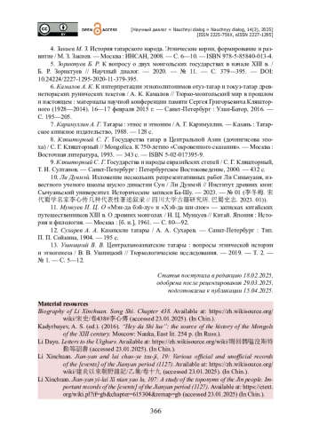 13. Ушницкий В. В. Центральноазиатские татары : вопросы этнической истории и этногенеза / В. В. Ушницкий // Тюркологические исследования. - 2019. - Т. 2. - № 1. - С. 5-12.