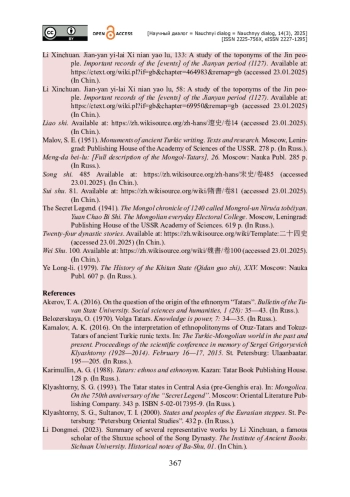 1. Акеров Т. А. К вопросу о происхождении этнонима «татар» / Т. А. Акеров // Вестник Тувинского государственного университета. Социальные и гуманитарные науки. - 2016. - № 1 (28). - С. 35-43.