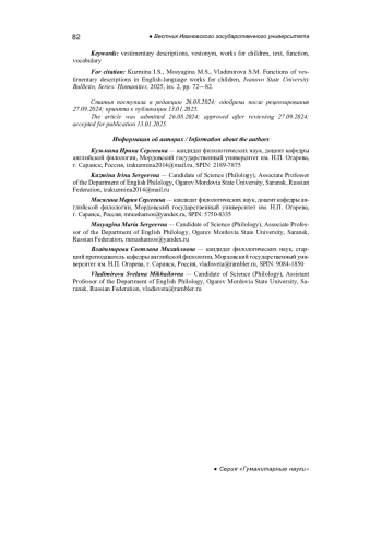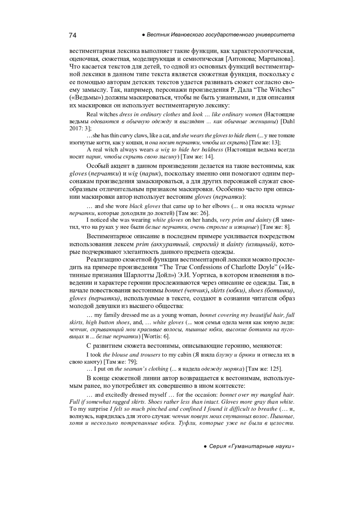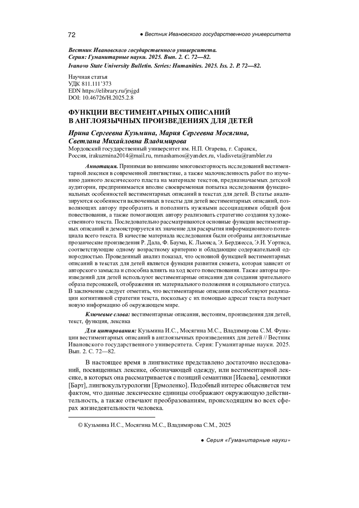 КУЗЬМИНА И. С., МОСЯГИНА М. С., ВЛАДИМИРОВА С. М. ФУНКЦИИ ВЕСТИМЕНТАРНЫХ ОПИСАНИЙ В АНГЛОЯЗЫЧНЫХ ПРОИЗВЕДЕНИЯХ ДЛЯ ДЕТЕЙ // ВЕСТНИК ИВАНОВСКОГО ГОСУДАРСТВЕННОГО УНИВЕРСИТЕТА. СЕРИЯ: ГУМАНИТАРНЫЕ НАУКИ. 2025. № 2